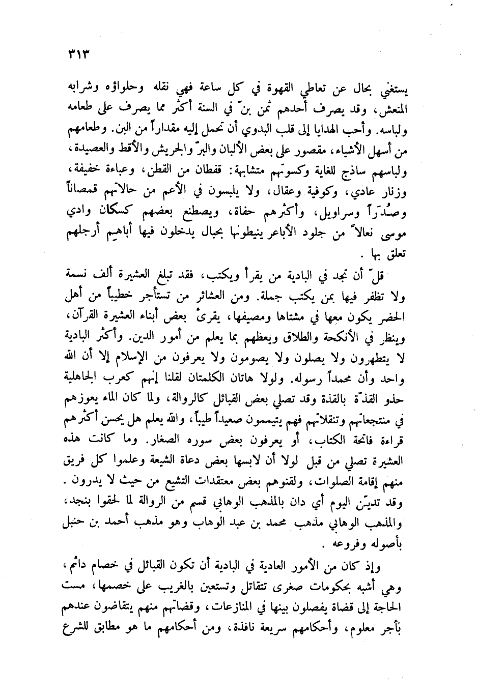 قّل أن تجد في البادية من يقرأ ويكتب، فقد تبلغ العشيرة ألف نسمة ولا تظفر فيها بمن يكتب جملة. ومن العشائر من تستأجر خطيباً من أهل الحضر يكون معها في مشتاها ومصيفها، ويعظم بما يعلم من أمور الدين. وأكثر البادية لا يتطهرون ولا يصلون ولا يصومون ولا يعرفون من الإسلام إلا أن الله واحد وأن محمداً رسوله. ولولا هاتان الكلمتان لقلنا إنهم كعرب الجاهلية حذو القذّة بالقذة وقد تصلي بعض القبائل كالرولة، ولما كان الماء يعوزهم في منتجعاتهم وتنقلاتهم فهم يتيممون صعيداً طيباً، والله يعلم هل يحسن أكثرهم قراءة فاتحة الكتاب، أو يعرفون سوره الصغار. وما كانت هذه العشيرة تصلي من قبل لولا أن لابسها بعض دعاة الشيعة وعلموا كل فريق منهم إقامة الصلوات، ولنقوهم بعض معتقدات التشيع من حيث لا يدرون. وقد تديّن اليوم أي دان بالمذهب الوهابي قسم من الروالة لما لحقوا بنجد، والمذهب الوهابي مذهب محمد بن عبد الوهاب وهو مذهب أحمد بن حنبل بأصوله وفروعه. وإذا كان من الأمور العادية في البادية أن تكون القبائل في خصام دائم، وهي أشبه بحكومات صغرى تتقاتل وتستعين بالغريب على خصمها، مست الحاجة إلى قضاة يفصلون بينها في المنازعات، وقضاتهم منهم يتقاضون عندهم بأجر معلوم، وأحكامهم سريعة نافذة، ومن أحكامهم ما هو مطابق للشرع