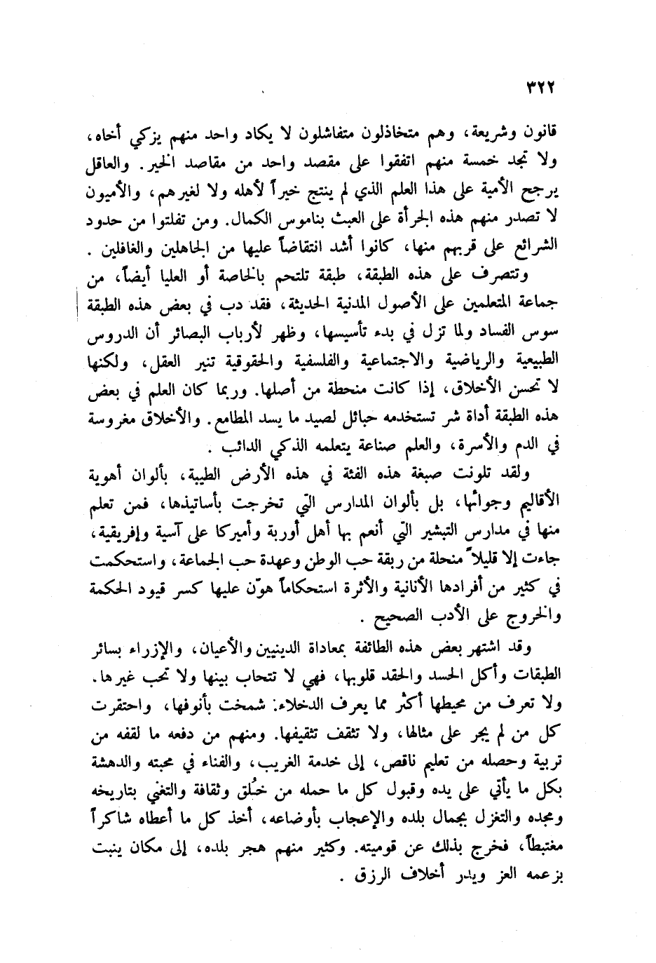 وتتصرف على هذه الطبقة، طبقة تلتحم بالخاصة أو العليا أيضاً، من جماعة المتعلمين على الأصول المدنية الحديثة، فقد دب في بعض هذه الطبقة سوس الفساد ولما تزل في بدء تأسيسها، وظهر لأرباب البصائر أن الدروس الطبيعية والرياضية والاجتماعية والفلسفية والحقوقية تنير العقل، ولكنها لا تحسن الأخلاق، إذا كانت منحطة من أصلها. وربما كان العلم في بعض هذه الطبقة أداء شر تستخدمه حبائل لصيد ما يسد المطامع. والأخلاق مغروسة في الدم والأسرة، والعلم صناعة يتعلمه الذكي الدائب.