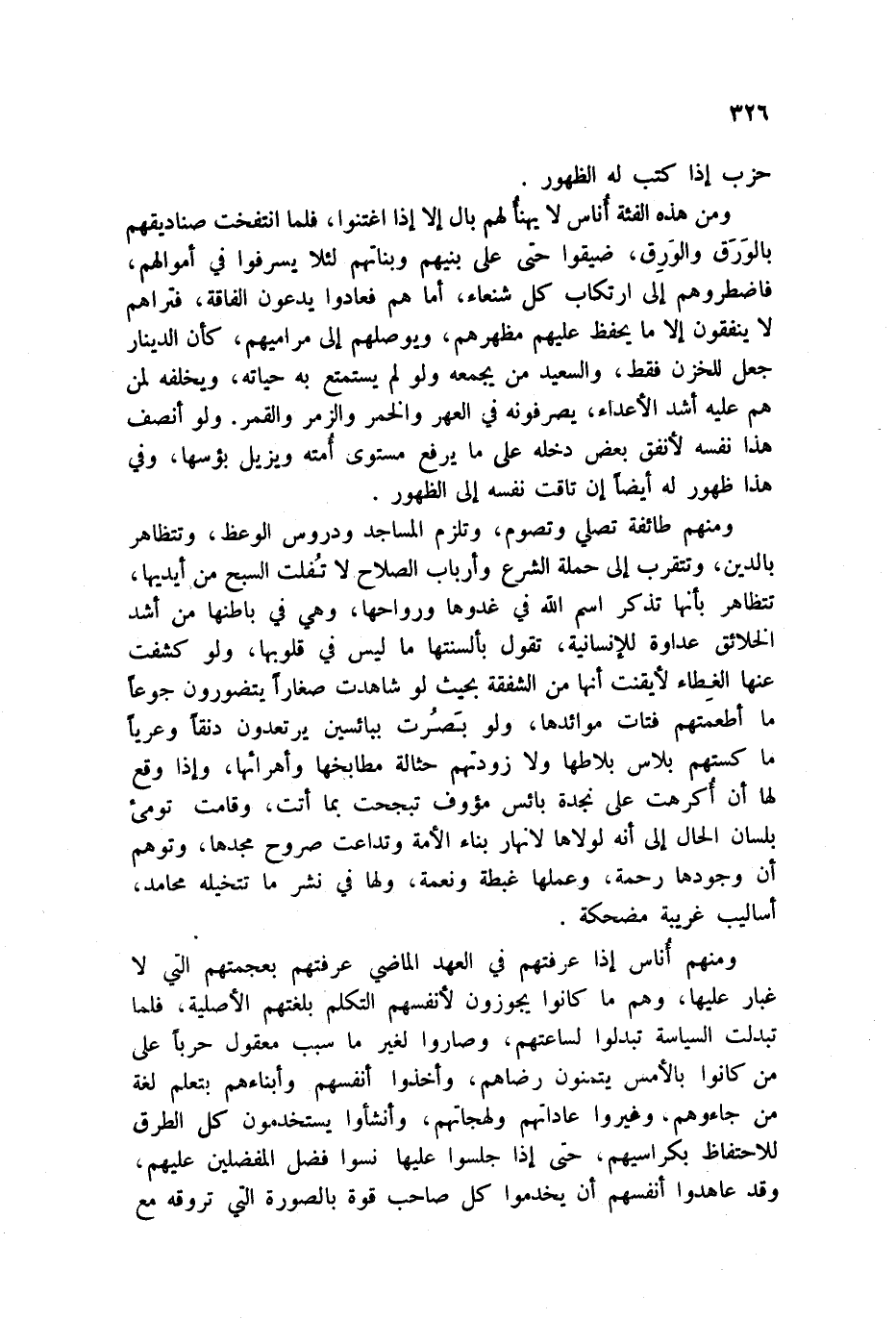 ومنهم طائفة تصلي وتصوم، وتلزم المساجد ودروس الوعظ، وتتظاهر بالدين، وتتقرب إلى حملة الشرع وأرباب الصلاح لا تُفلت السبح من أيديها، تتظاهر بأنها تذكر اسم الله في غدوها ورواحها، وهي في باطنها من أشد الخلائق عداوة للإنسانية، تقول بألسنتها ما ليس في قلوبهم، ولو كشفت عنها الغطاء لأيقنت أنها نمن الشفقة بحيث لو شاهدت صغاراً يتضورون جوعاً ما أطعمتهم فتات موائدها، ولو بَصُرت ببائسين يرتعدون دنقاً وعرياً ما كستهم بلاس بلاط ولا زودتهم حثالة مطابخها وأهرائها، وإذا وقع لها أن أكرهت على نجدة بائس نؤوف تبجحت بما أتت، وقامت تومئ بلسان الحال إلى أنه لولاها لنهار بناء الأمة وتداعت صروح مجدها، وتوهم أساليب غريبة مضحكة.