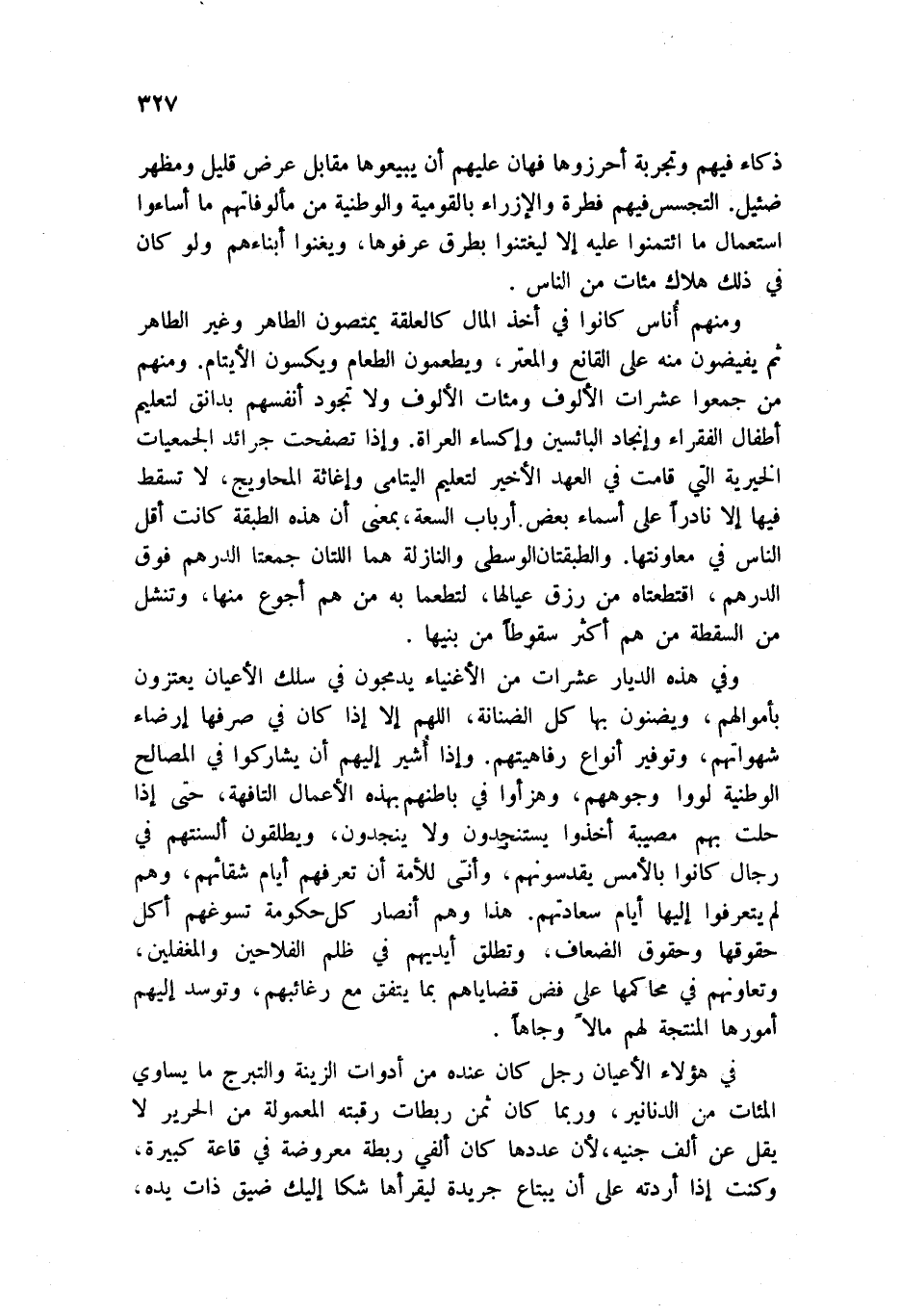 وفي هذه الديار عشرات من الأغنياء يدمجون في سلك الأعيان يعتزون بأموالهم، ويضنون بها كل الضنانة، اللهم إلا إذا كان في صرفها إرضاء شهواتهم، وتوفير أنواع رفاهيتهم. وإذا أشير إليهم أن يشاركوا في المصالح الوطنية لووا وجوههم، وهزءوا في باطنهم بهذه الأعمال التافهة، حتى إذا حلت بهم مصيبة أخذوا يستنجدون ولا ينجدون، ويطاقون ألسنتهم في رجال كانوا بالأمس يقدسونهم، وأنهّى للأمة أن تعرفهم أيام شقائهم، وهم لم يتعرفوا إليها أيام سعادتهم. وهذا وهم أنصار كل حكومة تسوغهم أكل حقوقها وحقوق الضعفاء، وتطلق أيديهم في ظلم الفلاحين والمغفلين، وتعاونهم في محاكمها على فض قضاياهم بما يتفق مع رغائبهم، وتوسد إليهم أمورها المنتجة لهم مالاً وجاهاً.