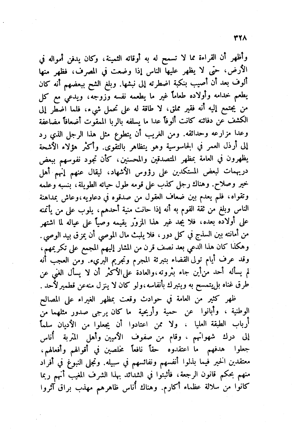 وبلغ الشح ببعضهم أنه كان يطعم خدامه وأولاده طعاماً غير ما يطعمه نفسه وزوجه، ويدعى مع كل من يجتمع إليه أنه فقير مملق، لا طاقة له على تحمل شيء، فلما اضطر إلى الكشف عن دفائنه كانت ألوفاً عدا ما يسلفه بالربا الممقوت أضعافاً مضاعفة وعدا مزارعه وحدائقه. ومن الغريب أن يتطوع مثل هذا الرجل الذي رد إلى أرذل العمر في الجاسوسية وهو يتظاهر بالتقوى. وأكثر هؤلاء الأشحة يظهرون في العامة بمظهر المتصدقين والمحسنين، وكأن تجود نفوسهم ببعض دريهمات لبعض المستكدين على رؤوس الأشهاد، ليقال عنهم إنهم أهل خير وصلاح. وهناك رجل يكذب على قومه طول حياته الطويلة، بنسبه وعلمه وتقواه، فلم يعدم ضعاف العقول من صدقوه في دعاويه، وعاش بمداهنة الناس وبلغ من ثقة القوم به أنه إذا حانت منية أحدهم، يلوب على من يأتمنه على أولاده بعده، فلا يجد غير هذا المزوّر يقيمه وصياً على عياله لما اشتهاه من أمانته بين السذج في كل دور، فلا يلبث مال الموصي أن يمزق بيد الوصي. وهكذا كان هذا الدعي بعد نصف قرن من المشار إليهم المجمع على تكريمهم، وقد عرف أيام تنولي القضاء بتبرئة المجرم وتجريم البريء. ومن العجب أنه لم يسأله أحد من أين جاء بثروته، والعادة على الأكثر أن لا يسأل الغني عن طرق غناه بل يتمسح به ويتبرك بأنفاسه، ولو كان لا ينزل منه عن قطمير لأحد.