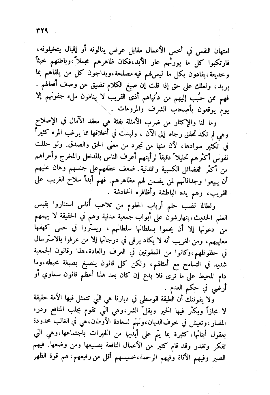 ولا يفوتنك أن الطبقة الوسطى في ديارنا هي التي تتمثل فيها الأمة حقيقة لا مجازاً ويكثر فيها الخير ويقّل فيها الشر، وهي التي تقوم بجلب المنافع ودرء