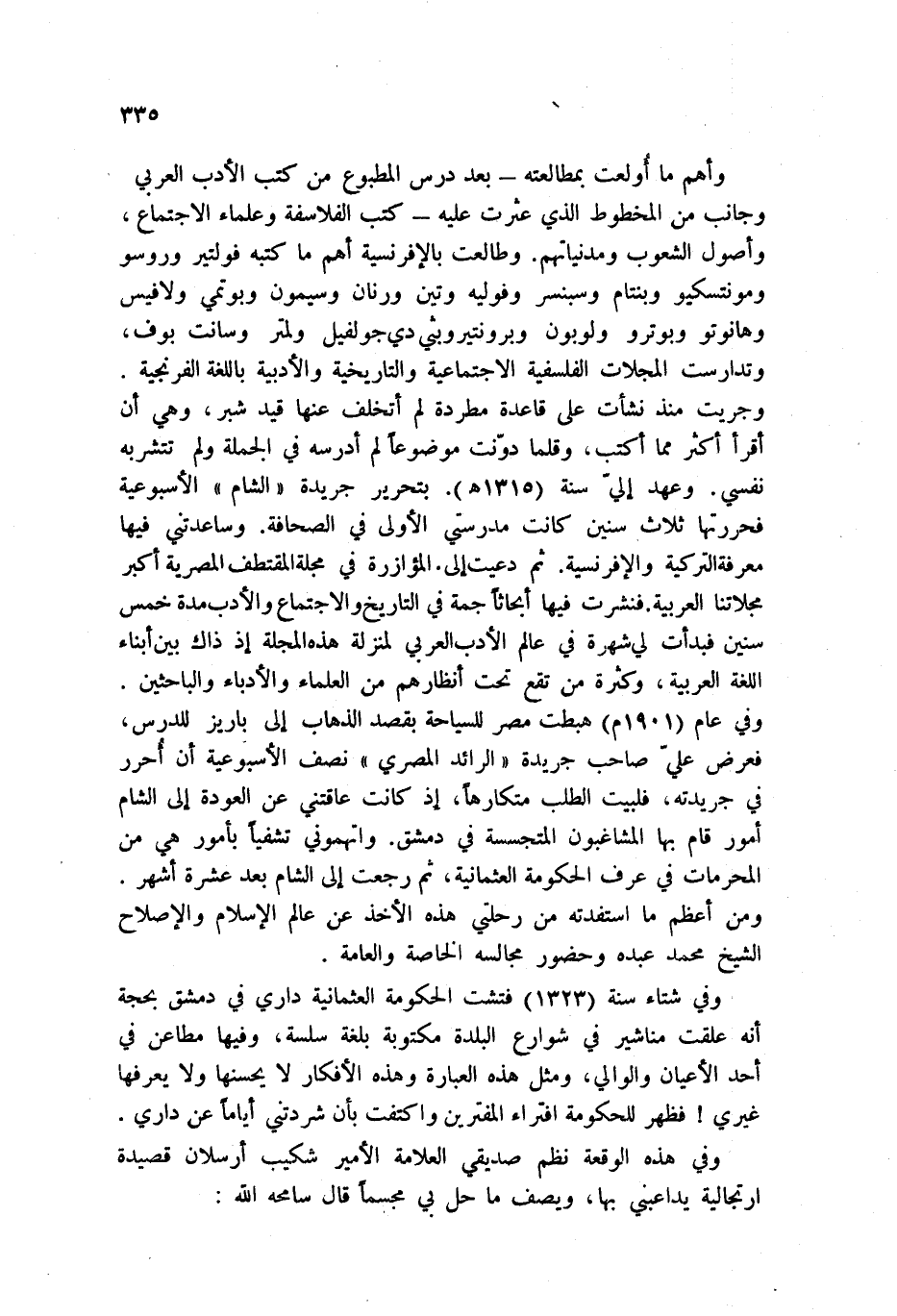 مناشير في شوارع البلدة مكتوبة بلغة سلسة، وفيها مطاعن في أحد الأعيان والوالي، ومثل هذه العبارة وهذه الأفكار لا يحسنها ولا يعرفها غيري! فظهر للحكومة افتراء المفترين واكتفت بأن شردتني أياماً عن داري. وفي هذه الوقعة نظم صديقي العلامة الأمير شكيب أرسلان قصيدة ارتجالية يداعبني بها، ويصف ما حل بي مجسماً قال سامحه الله: