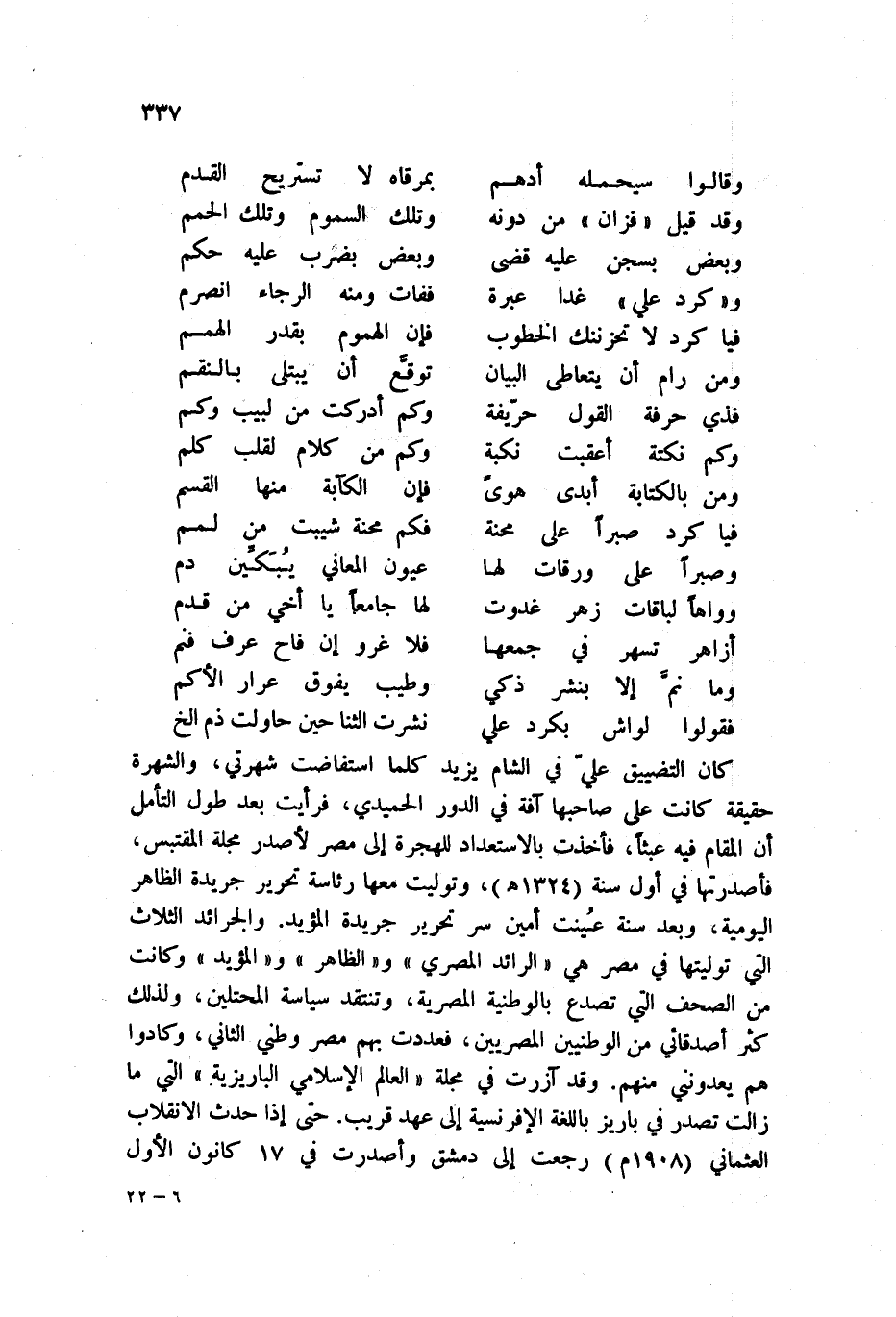 كان التضييق علي في الشام يزيد كما استفاضت شهرتي، والشهرة حقيقة كانت على صاحبها آفة في الدور الحميدي، فرأيت بعد طول التأمل أن المقام فيه عبثاً، فأخذت بالاستعداد للهجرة إلى مصر لأصدر مجلة المقتبس، فأصدرتها في أول سنة 1324هـ، وتوليت معها رئاسة تحرير جريدة الظاهر اليومية، وبعد سنة عينت أمير سر تحرير جريدة المؤيد. والجرائد ثلاث التي توليتها في مصر هي الرائد المصري والظاهر والمؤيد وكانت من الصحف التي تصدع بالوطنية المصرية، وتنتقد سياسة المحتلين، ولذلك كثر أصدقائي من الوطنيين لالمصريين، فعددت بهم مصر وطني الثاني، وكادوا هم يعدونني منهم. وقد آزرت في مجلة العالم الإسلامي الباريزية التي ما زالت تصدر في باريز باللغة الفرنسية إلى عهد قريب. حتى إذا حدث الانقلاب العثماني 1908م رجعت إلى دمشق وأصدرت في 17 كانون الأول