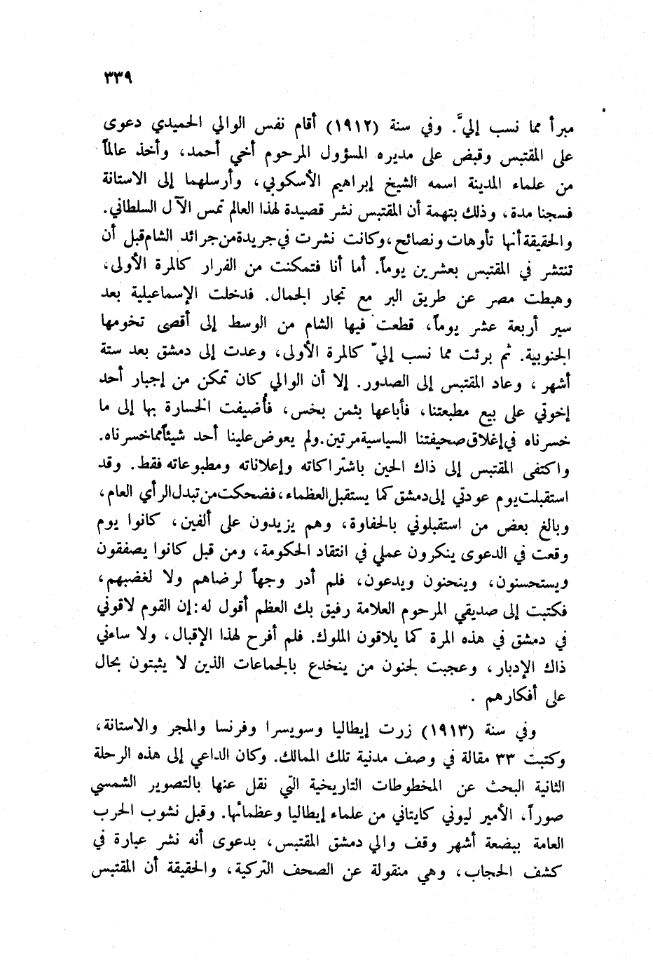 مبرأ مما نسب إلي. وفي سنة 1912 أقام نفس الوالي الحميدي دعوى على المقتبس وقبض على مديره المسؤول المرحوم أخي أحمد، وأخذ عالماً من علماء المدينة اسمه الشيخ إبراهيم الأسكوبي، وأرسلهما إلى الآستانة فسجنا مدة، وذلك بتهمة أن المقتبس نشر قصيدة لهذا العالم تمس الآل السلطاني.