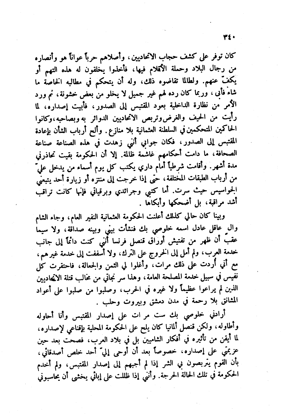 فيها، فأخذوا يخلقون له هذه التهم أو يكف عنهم. ولطالما تقاضوه ذلك، وله أن يتحكم في مطالبه الخاصة ما شاء فأبى، وربما كان رده لهم غير جميل لا يخلو من بعض خشونة، ثم ورد الأمر من نظارة الداخلية بعود المقتبس إلى الصدور، فأبيت إصداره، لما الحاكمين المتحكمين في السلطنة العثمانية بلا منازع. وألح أرباب الشأن بإعادة المقتبس إلى الصدور، فكان جوابي أنني زهدت في هذه الصناعة صناعة الصحافة، ما دامت أحكامهم غاشمة ظالمة. إلا أن الحكومة بقيت تحاذرني مدة أشهر. وأقامت شرطياً أمام داري يكتب كل يوم أسماء من يدخل علي من أربابا الطبقات المختلفة، حتى إذا خرجت إلى منتزه أو زيارة أحد يتبعني الجواسيس حيث سرت. أما كتبي وجرائدي وبرقياتي فإنها كانت تراقب أشد مراقبة، بل أضحكها وأبكاها.