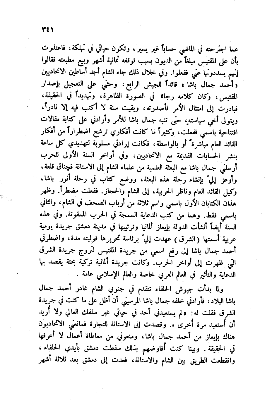 عما اجترحته في الماضي حساباً غير يسير، وتكون حياتي في تهلكة، فاعتذرت بأن على المقتبس مبلغاً من الديون بسبب توقفه ثمانية أشهر وبيع مطبعته فقالوا إنهم يسددونها عني ففعلوا. وفي خلال ذلك جاء أحد أساطين الاتحاديين أحمد جمال باشاً قائداً للجيش الرابع، وحثي على التعجيل بإصدار المقتبس، وكان كلامه رجاءً في الصورة الظاهرة، وتهديداً في الحقيقة، فبادرت إلى امتثال الأمر فأصدرته، وبقيت سنة لا أكتب فيه إلا نادراً، ويتولى أخي سياسته، حتى تنبه جمال باشا للأمر وأرادني على كتابة مقالات افتتاحية باسمي ففعلت، وكثيراً ما كانت أفكاري ترشح اضطراراً من أفكار القائد العام مباشرة أو بالواسطة، فكانت إرادتي مسلوبة لتهديدي كل ساعة بنشر الحسابات القديمة مع الاتحاديين، وفي أواخر السنة الأولى للحرب أرسلي جمال باشا مع البعثة العلمية من علماء الشام إلى الآستانة فجناق قلعة، وأوعز إلى بإنشاء رحلة هذه البعثة، ووضع كتاب في رحلة أنور باشا، وكيل القائد العام وناظر الحربية، إلى الشام والحجاز. ففعلت مضطراً. وظهر هذان الكتابان الأول باسمي واسم ثلاثة من أرباب الصحف في الشام، والثاني باسمي فقط. وهما من كتب الدعاية السمجة في الحرب الممقوتة. وفي هذه السنة أيضاً أنشأت الدولة بإيعاز ألمانيا وترتيبها في مدينة دمشق جريدة يومية عربية أسمتها الشرق عهدت إلي برئاسة تحريرها فوليته مدة، واضطرني أحمد جمال باشا إلى رفع اسمي من جريدة المقتبس لتروج جريدة الشرق التي ظهرت إلى أواخر الحرب. وكانت جريدة ألمانية تركية بحتة يقصد بها الدعاية والتأثير في العالم العربي خاصة والعالم الإسلامي عامة.