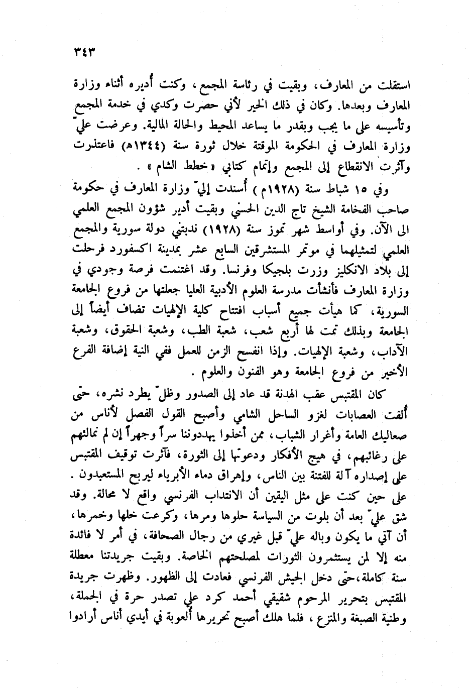 وفي 15 شباط سنة 1928م أسندت إلي وزارة المعارف في حكومة صاحب الفخامة الشيخ تاج الدين الحسني وبقيت أدير شؤون المجمع العلمي إلى الآن. وفي أواسط شهر تموز سنة 1928 ندبتني دولة سورية والمجمع العلمي لتمثيلها في مؤتمر المستشرقين السابع عشر بمدينة اكسفورد فرحلت إلى بلاد الإنكليز وزرت بلجيكيا وفرنسا. وقد اغتنمت فرصة وجودي في وزارة المعارف فأنشأت مدرسة العلوم الأدبية العليا جعلتها من فروع الجامعة السورية، كما هيأت جميع افتتاح أسباب كلية الإلهيات تضاف أيضاً إلى الجامعة وبذلك تمت لها أربع شعب، شعبة الطب، وشعبة الحقوق، وشعبة الآداب، وشعبة الإلهيات. وإذا انفسح الزمن للعمل ففي النية إضافة الفرع الأخير من فروع الجامعة وهو الفنون والعلوم.