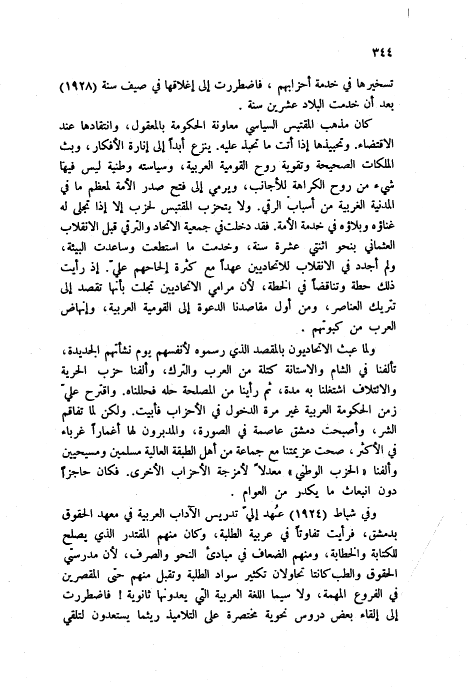 ولما عبث الاتحاديون بالمقصد الذي رسموه لأنفسهم يوم نشأتهم الجديدة، تألفنا في الشام والآستانة كتلة من العرب والترك، وألفنا حزب الحرية والائتلاف اشتغلنا به مدة، ثم رأينا من المصلحة حله فحللناه. وأقترح عليّ زمن الحومة العربية غير مرة الدخول في الأحزاب فأبيد. ولكن لما تفاقم الشر، وأصبحت دمشق عاصمة في الصورة، والمدبرون لها أغمارنا غرباء في الأكثر، صحت عزيمتنا مع جماعة من أهل الطبقة العالية مسلمين ومسيحيين وألفنا الحزب الوطني معدلاً لأمزجة الأحزاب الأخرى. فكان حاجزناً دون انبعاث ما يندر من العوم.