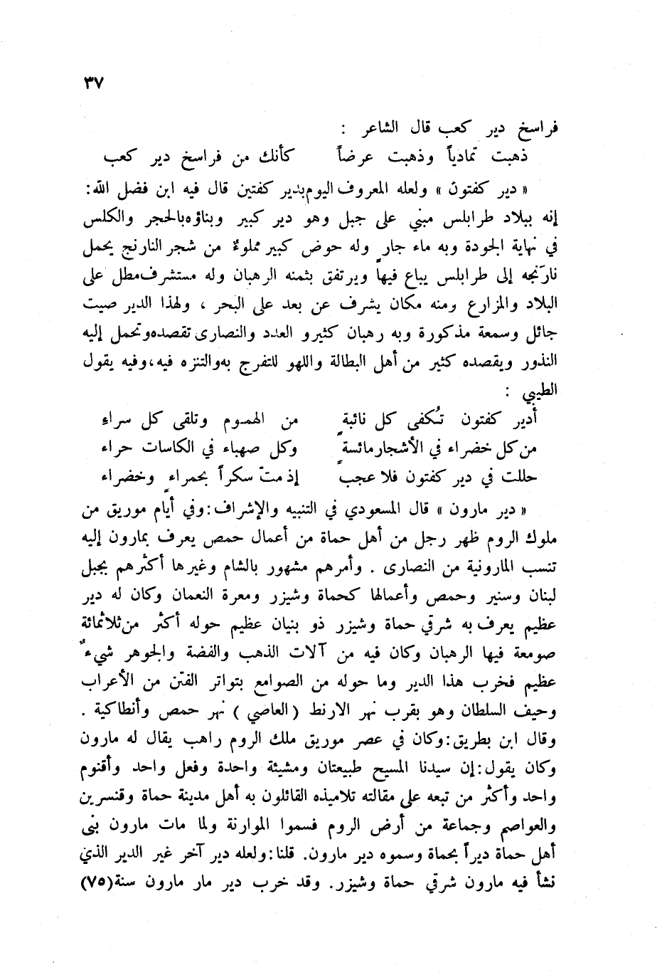 دير مارون قال المسعودي في التنبيه والإشراف: وفي أيام موريق من ملوك الروم ظهر رجل من أهل حماة من أعمال حمص يعرف بمارون إليه تنسب المارونية من النصارى. وأمرهم مشهور بالشام وغيرها أكثرهم بجبل لبنان وسنير وحمص وأعمالها كحماة وشيرز ومعرة النعمان وكان له دير عظيم يعرف به شرقي حماة ذو بميان عظيم حوله أكثر من ثلاثمائة صومعة فيعا الرهبان وكان فيه من آلات الذهب والفضة والجوهر شيء عظيم فخرب هذا الدير وما حوله من الصوامع بتواتر الفتن من الأعراب وحيف السلطان وهو بقرب نهر الأرنط العاصي نهر حمص وإنطاكية. وكان يقول: إن سيدنا المسيح طبيعتان ومشيئة واحدة وفعل واحد وأقنوم واحد وأكثر من تبعه على مقالته تلاميذه القائلون به أهل