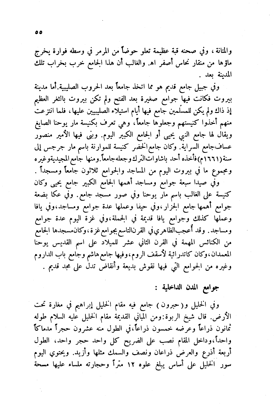 وفي جبيل جامع هو مما اتخذ جامعاً بعد الحروب الصليبية. أما مدينة بيروت فكانت فيها جوانع صغيرة بعد الفتح ولم تكن بيروت بالثغر العظيم إذ ذاك ولم يكن للمسلمين جامع فيها أيام استيلاء الصليبيين عليها، فلما انتزعت منهم أخذوا كنيستهم وجعلوا جامعاً، وهي تعرف بكنيسة ماريو حنا الصايغ ويقال لها جامع النبي يحيى أو الجامع الكبير اليوم. وبنى فيها الأمير منصور عساف جامع السراية. وكان جامع الخضر كنيسة للموارنة باسم مار جرجس إلى سنة 1661م فأخذه أحد باشوات الترك وجعله جامعاً. ومنها جامع المجيدية وغيره ومجموع ما في بيروت اليوم من المساجد والجوامع ثلاثون جامعاً ومسجداً.