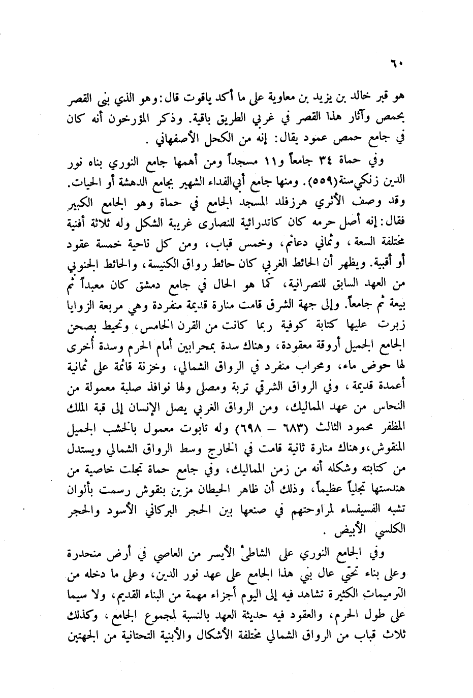 وفي حماة 34 جامعاً و11 مسجداً ومن أهمها النوري بناه نور الدين زنكي سنة 559. ومنها أبي الفداء الشهير بجامع الدهشة أو الحيات. وقد وصف الأثري هرزفلد المسجد الجامع في حماة وهو الجامع الكبير فقال: إنه أصل حرمه كان كاتدرائية للنصارى غريبة الشكل وله ثلاثة أفنية مختلفة السعة، وثماني دعائم، وخمس قباب، ومن كل ناحية خمسة عقود أو أقبية. ويظهر أن الحائط الغربي كان حائط رواق الكنيسة، والحائط الجنوبي من العهد السابق للنصرانية، كما هو الحال في جامع دمشق كان معبداً ثم بيعة ثم جامعاً. وإلى جهة الشرق قامت منارة قديمة منفردة وهي مربعة الزوايا زبرت عليها كتابة كوفية ربما كانت من القرن الخامس، وتحيط بصحن الجامع الجميل أروقة معقودة، وهناك سدة بمحرابين أمام الحرم وسدة أخرى لها حوض قديمة، وفي الرواق الشرقي تربة ومصلى ولها نوافذ صلبة معمولة من النحاس من عهد المماليك، ومن الرواق الغربي يصل الإنسان إلى قبة الملك المظفر محمود الثالث 683 - 698 وله تابوت معمول بالخشب الجميل المنقوش، وهناك منارة ثانية قامت في الخارج وسط الرواق الشمالي ويستدل من كتابته وشكله أنه من زمن المماليك، وفي جامع حماة تجلت خاصية من هندستها تجلياً عظيماً، وذلك أن ظاهر الحيطان مزين بنقوش رسمت بألوان تشبه الفسيفساء لمراوحتهم في صنعها بين الحجر البركاني الأسود والحجر الكلسي الأبيض.
