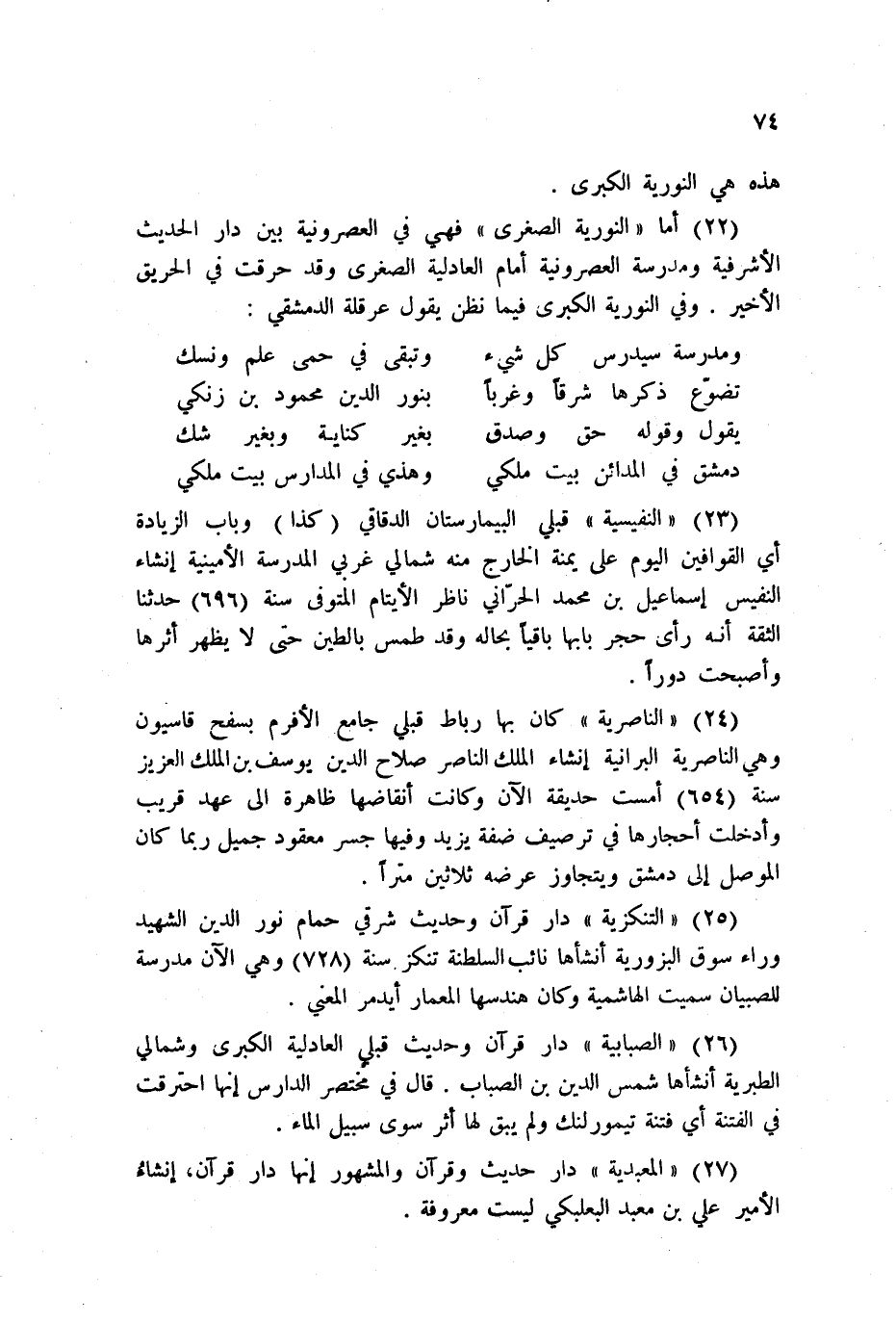 22 - النورية الصغرى فهي في العصرونية بين دار الحديث الأشرفية ومدرسة العصرونية أمام العادلية الصغرى وقد حرقت في الحريق الأخير. وفي النورية الكبرى فيما تظن يقول عرقلة الدمشقي: