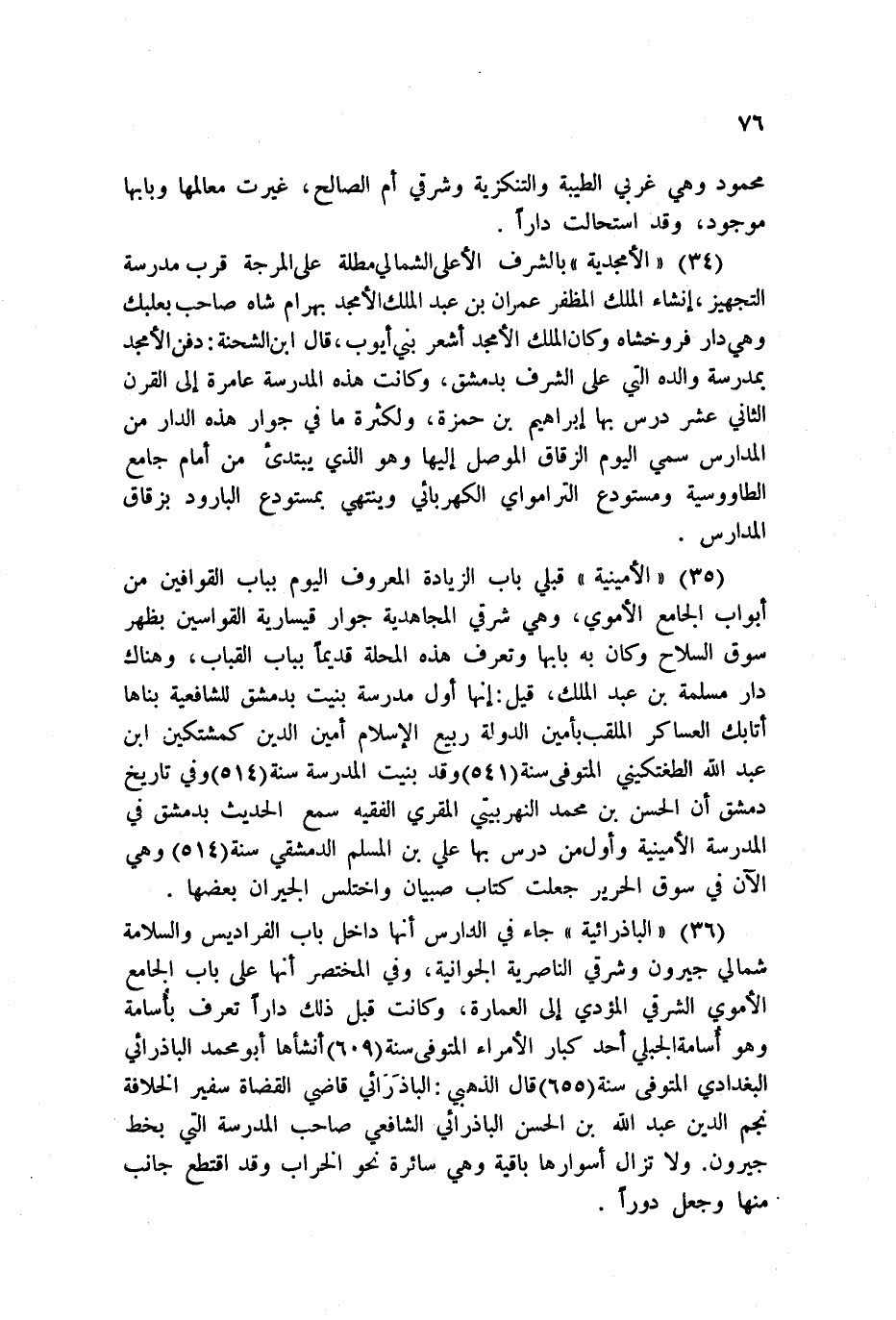 34 - الأمجدية بالشرف الأعلى الشمالي مطلة على المرجة قرب مدرسة التجهيز، إنشاء الملك المظفر عمران بن عبد الملك الأمجد بهرام شاه صاحب بعلبك وهي دار فروخشاه وكان الملك الأمجد أشعر بني أيوب، قال ابن الشحنة: دفن الأمجد بمدرسة والده التي على الشرف بدمشق، وكانت هذه المدرسة عامرة إلى القرن الثاني عشر درس بها إبراهيم بن حمزة، لكثرة ما في جوار هذه الدار من المدارس سمي اليوم الزقاق الموصل إليها وهو الذي يبتدئ من أمام جامع الطاووسية ومستودع الترامواي الكهربائي وينتهي بمستودع البارود بزقاق المدارس.
