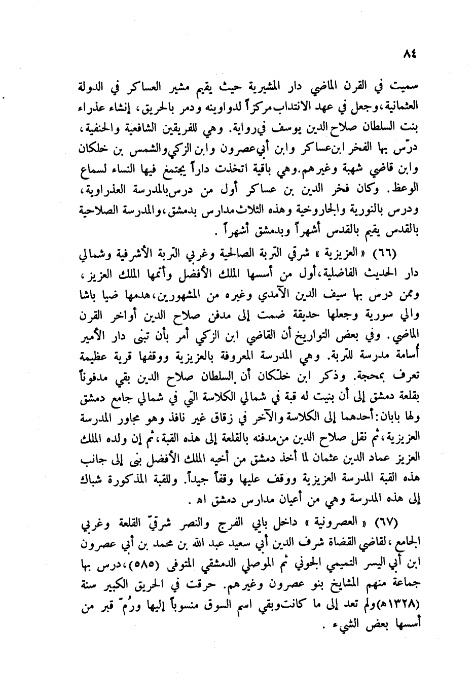 66 - العزيزية شرقي التربة الصابلحية وغربي التربة الأشرفية وشمالي دار الحديث الفاضلية، أول من أسسها الملك الأفضل وأتمها الملك العزيز، وممن درس بها سيف الدين الآمدي وغيره من المشهورين، وهدمها ضياء باشا والي سورية