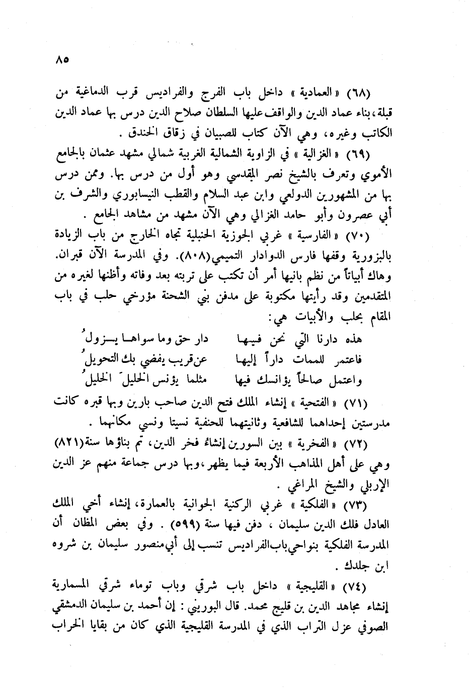 70 - الفارسية غربي الجوزية الحنبلية تجاه الخارج من باب الزيادة بالبزورية وقفها فارس الدوادار التميمي808. وفي المدرسة الآن قبران. وهاك أبياتاً من نظم بانيها أمر أن تكتب على تربته بعد وفاته وأظنها لغيره من المتقدمين وقد رأيتها مكتوبة على مدفن بني الشحنة مؤرخي حلب في باب المقام بحلب والأبيات هي: