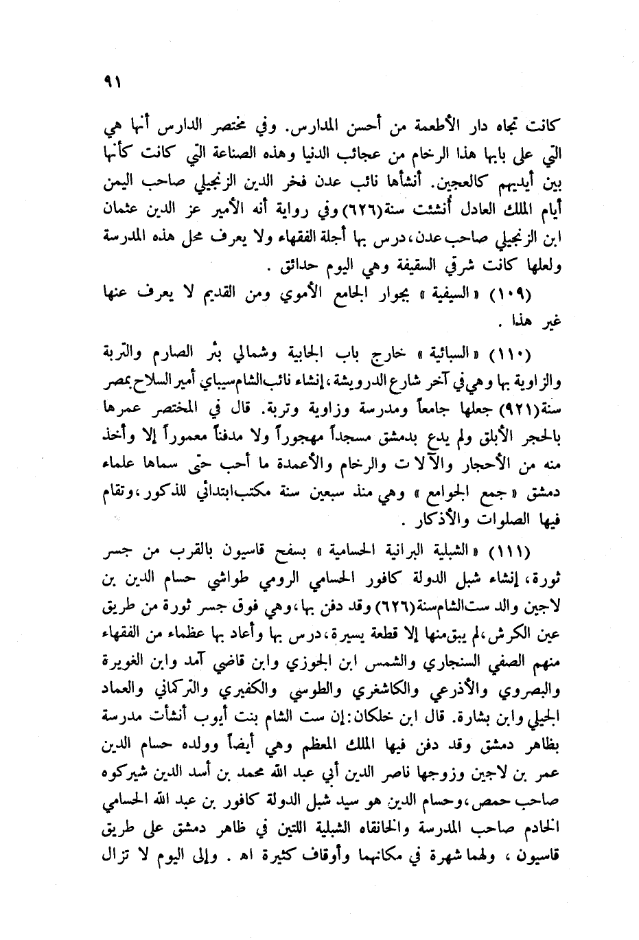 111 - الشبلية البرانية الحماسية بسفح قاسيون بالقرب من جسر ثورة، إنشاء شبل الدولة كافور الحسامي الرومي طواشي حسام الدين بن لاجين والدست الشام سنة 626 وقد دفن بها، وهي فوق جسر ثورة من طريق عين الكرش، لم يبق منها إلا قطعة يسيرة، درس بها وأعاد بها عظماء من الفقهاء منهم الصفي السنجاري والشمس ابن الجوزي وابن قاضي آمد وابن الغويرة والبصروي والأذرعي والكاشغري والطوسي والكفيري والتركماني والعماد الجيلي وابن بشارة. قال ابن خلكان: إن ست الشام بنت أيوب أنشأت مدرسة بظاهر دمشق وقد دفن فيها الملك المعظم وهي أيضاً وولده حسام الدين عمر بن لاجين وزوجها ناصر الدين أبي عبد الله محمد بن أسد الدين شيركوه صاحب حمص، وحسام الدين هو