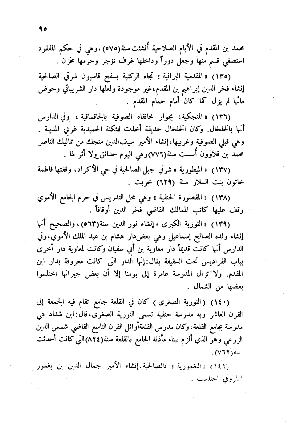139 - النورية الكبرى إنشاء نور الدين سنة 563، والصحيح أنها إنشاء ولده الصالح إسماعيل وهي بعض دار هشام بن عبد الملك الأموي، وفي الدارس أنها كانت قديماً دار معاوية بن أبى سفيان وكانت لمعاوية دار أخرى بباب الفراديس تحت السقيفة يقال: إنها الدار التي كانت معروفة بدار ابن المقدم. ولا تزال المدرسة عامرة إلى يومنا إلا أن بعض جيرانها اختلسوا بعضها من الشمال.