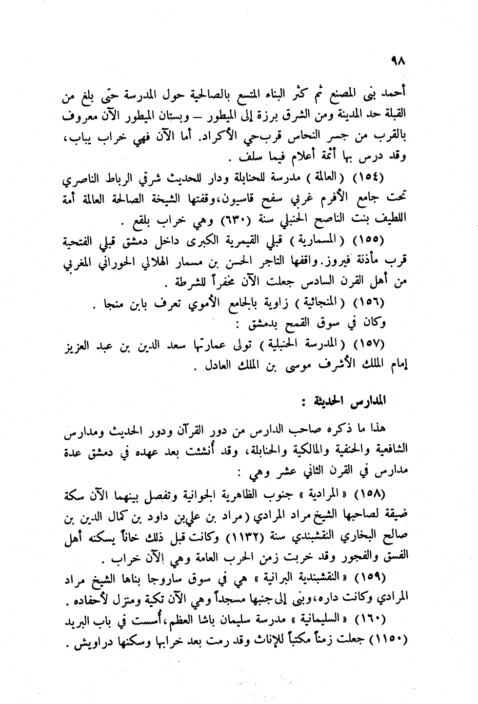 هذا ما ذكره صاحب الدارس من دور القرآن ودور الحديث ومدارس الشافعية والحنفية والمالكية والحنابلة، وقد أنشئت بعد عهده في دمشق عدة مدارس في القرن الثاني عشر وهي:
