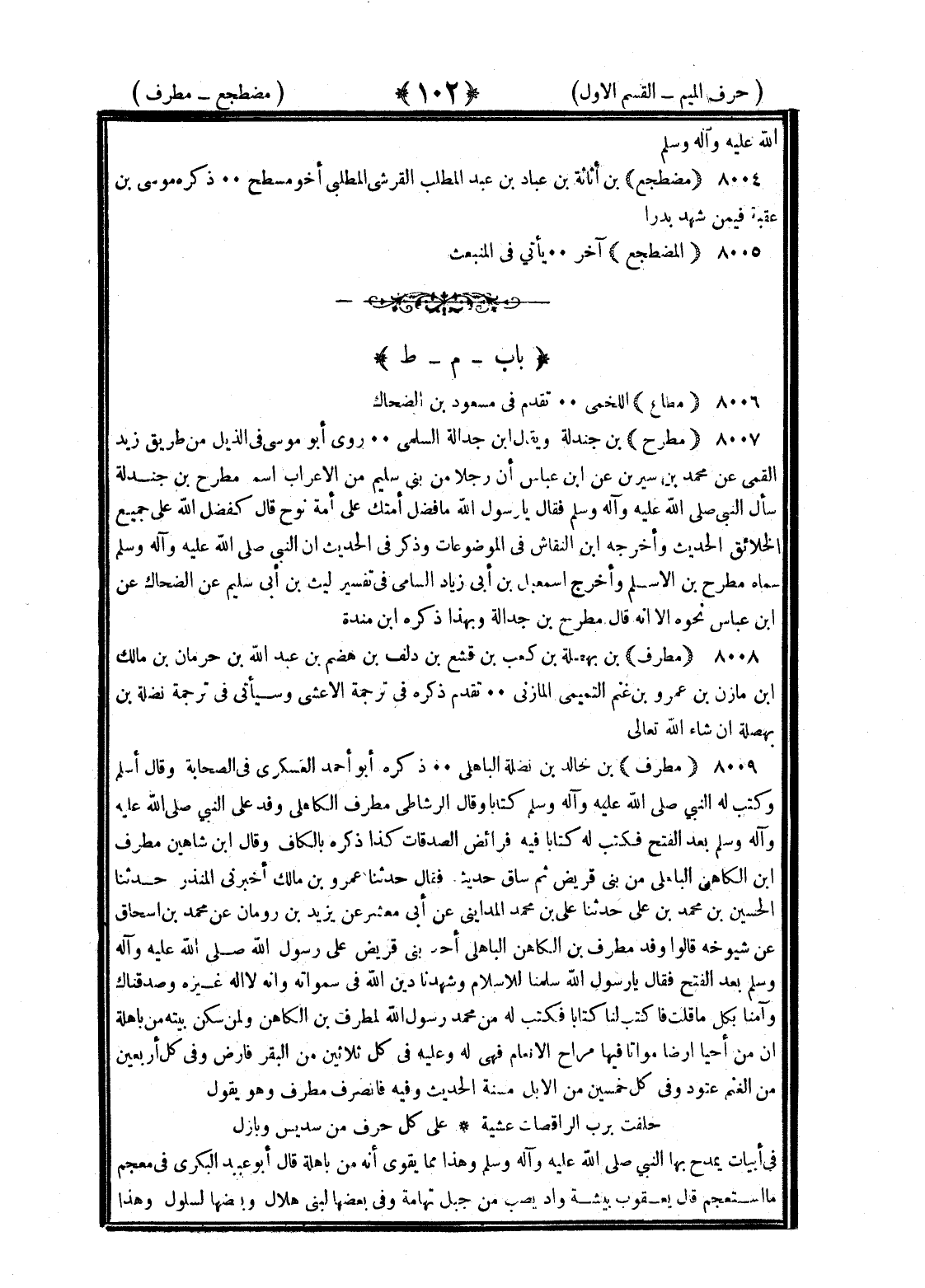 <102> الله عليه وسلم مضطجع بن أثاثة بن عباد بن عبد المطلب القرشي المطلبي أخو مسطح ذكره موسى بن عقبة فيمن شهد بدرا المضطجع آخر يأتي في المنبعث الميم بعدها الطاء مطاع اللخمي تقدم في مسعود بن الضحاك مطرح بن جندلة ويقال بن جدالة السلمي روى أبو موسى في الذيل من طريق زيد القمي عن محمد بن سيرين عن بن عباس أن رجلا من بني سليم من الأعراب اسمه مطرح بن جندلة سأل النبي صلى الله عليه وسلم فقال يا رسول الله ما فضل أمتك على أمة نوح قال كفضل الله على جميع الخلائق الحديث وأخرجه بن النقاش في الموضوعات وذكر في الحديث أن النبي صلى الله عليه وسلم سماه مطرح بن الإسلام وأخرج إسماعيل بن أبي زياد السامي في تفسير ليث بن أبي سليم عن الضحاك عن بن عباس نحوه إلا أنه قال مطرح بن جدالة وبهذا ذكره بن منده مطرف بن بهصل بن كعب بن قثع بن دلف بن هيصم بن عبد الله بن حرماز بن مالك بن مازن بن عمرو بن تميم التميمي المازني تقدم ذكره في ترجمة الأعشى وسيأتي في ترجمة نضلة بن بهصل إن شاء الله تعالى مطرف بن خالد بن نضلة الباهلي ذكره أبو أحمد العسكري في الصحابة وقال أسلم وكتب له النبي صلى الله عليه وسلم كتابا وقال الرشاطي مطرف الكاهلي وفد على النبي صلى الله عليه وسلم بعد الفتح فكتب له كتابا فيه فرائض الصدقات كذا ذكره بالكاف وقال بن شاهين مطرف بن الكاهن الباهلي من بني فريص ثم ساق حديثه فقال حدثنا عمرو بن مالك أخبرني المنذر حدثنا الحسين بن محمد بن علي حدثنا علي بن محمد المدائني عن أبي معشر عن يزيد بن رومان عن محمد بن إسحاق عن شيوخه قالوا وفد مطرف بن الكاهن الباهلي أحد بني فريص على رسول الله صلى الله عليه وسلم بعد الفتح فقال يا رسول الله سلمنا للإسلام وشهدنا دين الله في سماواته وأنه لا إله غيره وصدقناك وآمنا بكل ما قلت فاكتب لنا كتابا فكتب له من محمد رسول الله لمطرف بن الكاهن ولمن سكن بيته من باهلة إن من أحيا أرضا مواتا فيها مراح الأنعام فهي له وعليه في كل ثلاثين من البقر فارض وفي كل أرعين من الغنم عتود وفي كل خمسين من الإبل مسنة الحديث وفيه فانصرف مطرف وهو يقول حلفت برب الراقصات عشية على كل حرف من سديس وبازل في أبيات يمدح بها النبي صلى الله عليه وسلم وهذا مما يقوي أنه من باهلة قال أبو عبيد البكري في معجم ما استعجم قال يعقوب بيشة واد يصب من جبل تهامة وفي بعضها لبني هلال وبعضها لسلول وهذا §