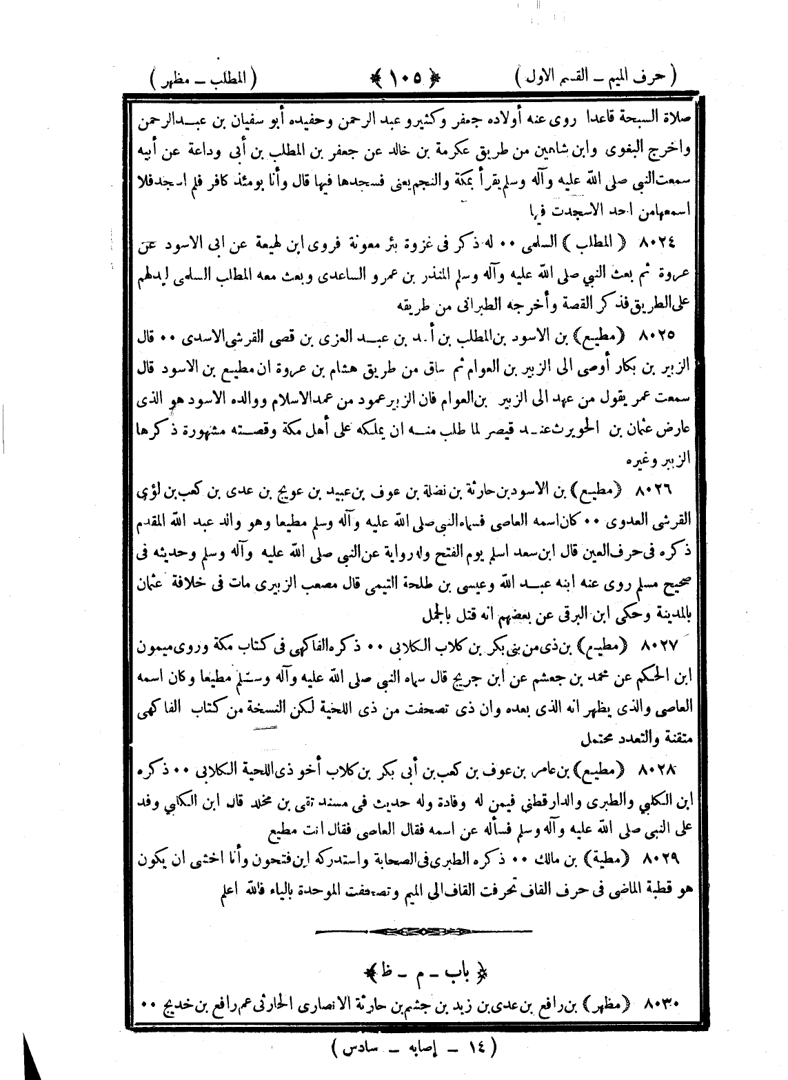 <105> صلاة السبحة قاعدا روى عنه أولاده جعفر وكثير وعبد الرحمن وحفيده أبو سفيان بن عبد الرحمن وأخرج البغوي وابن شاهين من طريق عكرمة بن خالد عن جعفر بن المطلب بن أبي وداعة عن أبيه سمعت النبي صلى الله عليه وسلم يقرأ بمكة والنجم يعني فسجد فيها وقال وأنا يومئذ كافر فلم أسجد فلا أسمعها من أحد إلا سجدت فيها المطلب السلمي له ذكر في غزوة بئر معونة فروى بن لهيعة عن أبي الأسود عن عروة ثم بعث النبي صلى الله عليه وسلم المنذر بن عمرو الساعدي وبعث معه المطلب السلمي ليدلهم على الطريق فذكر القصة وأخرجه الطبراني من طريقه مطيع بن الأسود بن المطلب بن أسد بن عبد العزى بن قصي القرشي الأسدي قال الزبير بن بكار أوصى إلى الزبير بن العوام ثم ساق من طريق هشام بن عروة أن مطيع بن الأسود قال سمعت عمر يقول من عهد إلى الزبير بن العوام فإن الزبير عمود من عمد الإسلام ووالده الأسود هو الذي عارض عثمان بن الحويرث عند قيصر لما طلب منه أن يملكه على أهل مكة وقصته مشهورة ذكرها الزبير وغيره مطيع بن الأسود بن حارثة بن نضلة بن عوف بن عبيد بن عويج بن عدي بن كعب بن لؤي القرشي العدوي كان اسمه العاصي فسماه النبي صلى الله عليه وسلم مطيعا وهو والد عبد الله المتقدم ذكره في حرف العين قال بن سعد أسلم يوم الفتح وله رواية عن النبي صلى الله عليه وسلم وحديثه في صحيح مسلم روى عنه ابنه عبد الله وعيسى بن طلحة التيمي قال مصعب الزبيري مات في خلافة عثمان بالمدينة وحكى بن البرقي عن بعضهم أنه قتل بالجمل مطيع بن ذي من بني بكر بن كلاب الكلابي ذكره الفاكهي في كتاب مكة وروى عن ميمون بن الحكم عن محمد بن جعشم عن بن جريج قال سماه النبي صلى الله عليه وسلم مطيعا وكان اسمه العاصي والذي يظهر أنه الذي بعده وأن ذي تصحفت من ذي اللحية لكن النسخة من كتاب الفاكهي متقنة والتعدد محتمل مطيع بن عامر بن عوف بن كعب بن أبي بكر بن كلاب أخو ذي اللحية الكلابي ذكره بن الكلابي والطبراني والدارقطني فيمن له وفادة وله حديث في مسند بقي بن مخلد قال بن الكلبي وفد على النبي صلى الله عليه وسلم فسأله عن اسمه فقال العاصي فقال أنت مطيع مطية بن مالك ذكره الطبري في الصحابة واستدركه بن فتحون وأنا أخشى أن يكون هو قطبة المضاي في حرف القاف فتصحفت القاف إلى الميم وتصحفت الموحدة بالباء فالله أعلم الميم بعدها الظاء مظهر بن رافع بن عدي بن يزيد بن جشم بن حارثة الأنصاري الحارثي عم رافع بن خديج §