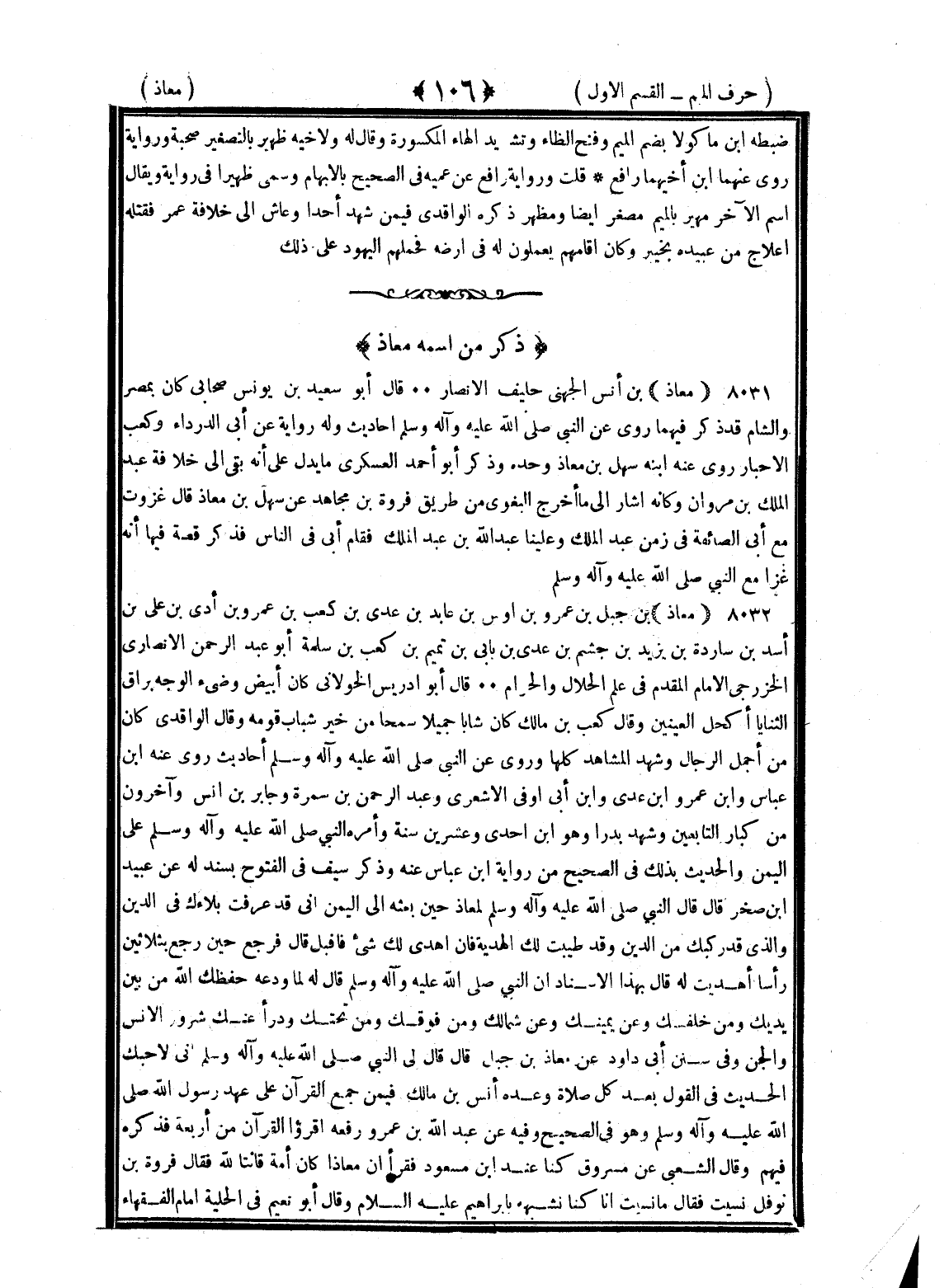 <106> ضبطه بن ماكولا بضم الميم وفتح الظاء وتشديد الهاء المكسورة وقال له ولأخيه ظهير بالتصغير صحبة ورواية روى عنهما بن أخيهما رافع قلت ورواية رافع عن عميه في الصحيح بالإبهام وسمي ظهيرا في رواية ويقال اسم الآخر مهير بالميم مصغر أيضا ومظهر ذكره الواقدي فيمن شهد أحدا وعاش إلى خلافة عمر فقتله أعلاج من عبيدة بخيبر وكان أقامهم يعملون له في أرضه فحملهم اليهود على ذلك ذكر من اسمه معاذ معاذ بن أنس الجهني حليف الأنصار قال أبو سعيد بن يونس صحابي كان بمصر والشام قد ذكر فيهما روى عن النبي صلى الله عليه وسلم أحاديث وله رواية عن أبي الدرداء وكعب الأحبار روى عنه ابنه سهل بن معاذ وحده وذكر أبو أحمد العسكري ما يدل على أنه بقي إلى خلافة عبد الملك بن مروان وكأنه أشار إلى ما أخرج البغوي من طريق فروة بن مجاهد عن سهل بن معاذ قال غزوت مع أبي الصائفة في زمن عبد الملك وعلينا عبد الله بن عبد الملك فقام أبي في الناس فذكر قصة فيها أنه غزا مع النبي صلى الله عليه وسلم معاذ بن جبل بن عمرو بن أوس بن عائذ بن عدي بن كعب بن عمرو بن أدى بن علي بن أسد بن ساردة بن يزيد بن جشم بن عدي بن نابي بن تميم بن كعب بن سلمة أبو عبد الرحمن الأنصاري الخزرجي الإمام المقدم في علم الحلال والحرام قال أبو إدريس الخولاني كان أبيض وضيء الوجه براق الثنايا أكحل العينين وقال كعب بن مالك كان شابا جميلا سمحا من خير شباب قومه وقال الواقدي كان من أجمل الرجال وشهد المشاهد كلها وروى عن النبي صلى الله عليه وسلم أحاديث روى عنه بن عباس وابن عمر وابن عدي وابن أبي أوفى الأشعري وعبد الرحمن بن سمرة وجابر بن أنس وآخرون من كبار التابعين وشهد بدرا وهو بن إحدى وعشرين سنة وأمره النبي صلى الله عليه وسلم على اليمن والحديث بذلك في الصحيح من رواية بن عباس عنه وذكر سيف في الفتوح بسند له عن عبيد بن صخر قال قال النبي صلى الله عليه وسلم لمعاذ حين بعثه إلى اليمن إني قد عرفت بلاءك في الدين والذي قد ركبك من الدين وقد طيبت لك الهدية فإن أهدي لك شيء فاقبل قال فرجع حين رجع بثلاثين رأسا أهديت له قال بهذا الأسناد إن النبي صلى الله عليه وسلم قال له لما ودعه حفظك الله من بين يديك ومن خلفك وعن يمينك وعن شمالك ومن فوقك ومن تحتك وأدرأ عنك شرور الإنس والجن وفي سنن أبي داود عن معاذ بن جبل قال قال لي النبي صلى الله عليه وسلم إني لأحبك الحديث في القول بعد كل صلاة وعده أنس بن مالك فيمن جمع القرآن على عهد رسول الله صلى الله عليه وسلم وهو في الصحيح وفيه عن عبد الله بن عمرو رفعه اقرءوا القرآن من أربعة فذكره فيهم وقال الشعبي عن مسروق كنا عند بن مسعود فقرأ إن معاذا كان أمة قانتا لله فقال فروة بن نوفل نسيت فقال ما نسيت إنا كنا نشبهه بإبراهيم عليه السلام وقال أبو نعيم في الحلية إمام الفقهاء §