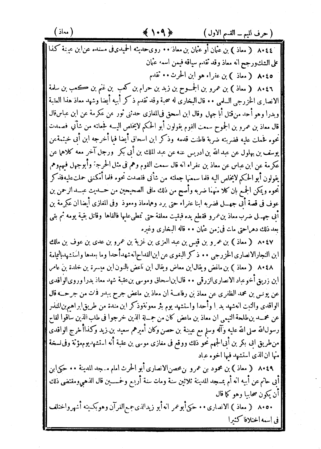 <109> معاذ بن عثمان أو عثمان بن معاذ روى حديثه الحميدي في مسنده عن بن عيينة كذا على الشك ورجح أنه معاذ وقد تقدم سياقه فيمن اسمه عثمان معاذ بن عفراء هو بن الحارث تقدم معاذ بن عمرو بن الجموح بن زيد بن حرام بن كعب بن غنم بن كعب بن سلمة الأنصاري الخزرجي السلمي قال البخاري له صحبة وقد تقدم ذكر أبيه أيضا وشهد معاذ هذا العقبة وبدرا وهو أحد من قتل أبا جهل وقال بن إسحاق في المغازي حدثني ثور عن عكرمة عن بن عباس قال قال معاذ بن عمرو بن الجموح سمعت القوم يقولون أبو الحكم لا يخلص إليه فجعلته من شأني فصمدت نحوه فحملت عليه فضربته ضربة فأطنت قدمه وذكر بن إسحاق أيضا فيما أخرجه بن أبي خيثمة عن يوسف بن بهلول عن عبد الله بن إدريس عنه عن عبد الملك بن أبي بكر ورجل آخر معه كلاهما عن عكرمة عن بن عباس عن معاذ بن عفراء أنه قال سمعت القوم وهم في مثل الحرجة وأبو جهل فيهم وهم يقولون أبو الحكم لا يخلص إليه فلما سمعتها جعلته من شأني فقصدت نحوه فلما أمكنني حملت عليه فذكر نحوه ويمكن الجمع بأن كلا منهما ضربه وأصح من ذلك ما في الصحيحين من حديث عبد الرحمن بن عوف في قصة أبي جهل فضربه ابنا عفراء حتى برد وهما معاذ ومعوذ وفي المغازي أيضا أن عكرمة بن أبي جهل ضرب معاذ بن عمرو فقطع يده فبقيت معلقة حتى تمطى عليها فألقاها وقاتل بقية يومه ثم بقي بعد ذلك دهرا حتى مات في زمن عثمان قاله البخاري وغيره معاذ بن عمرو بن قيس بن عبد العزى بن غزية بن عمرو بن عدي بن عوف بن مالك بن النجار الأنصاري الخزرجي ذكر البغوي عن بن القداح أنه شهد أحدا وما بعدها واستشهد باليمامة معاذ بن ماعص ويقال بن معاص ويقال بن ناعص بالنون بن ميسرة بن خلدة بن عامر بن زريق أخو عباد الأنصاري الزرقي قال بن إسحاق وموسى بن عقبة شهد معاذ بدرا وروى الواقدي عن يونس بن محمد الظفري عن معاذ بن رفاعة أن معاذ بن ماعص جرح ببدر فمات من جرحه قال الواقدي والثبت أنه شهد بدرا وأحدا واستشهد يوم بئر معونة وذكر بن منده من طريق إبراهيم بن المنذر عن محمد بن طلحة التيمي أن معاذ بن ماعص كان من جملة الذين خرجوا في طلب الذين ساقوا لفاح رسول الله صلى الله عليه وسلم مع عيينة بن حصن وكان أميرهم سعيد بن زيد وكذا أخرج الواقدي من طريق أبي بكر بن أبي الجهم نحو ذلك ووقع في مغازي موسى بن عقبة أنه استشهد يوم مؤتة وفي نسخة منها أن الذي استشهد فيها أخوه عباد معاذ بن محمود بن عمرو بن محصن الأنصاري أبو الحارث إمام مسجد المدينة حكى بن أبي حاتم عن أبيه أنه أم بمسجد المدينة ثلاثين سنة ومات سنة أربع وخمسين قال الذهبي ومقتضى ذلك أن يكون صحابيا وهو كما قال معاذ الأنصاري حكى أبو عمر أنه أبو زيد الذي جمع القرآن وهو بكنيته أشهر واختلف في اسمه اختلافا كثيرا §