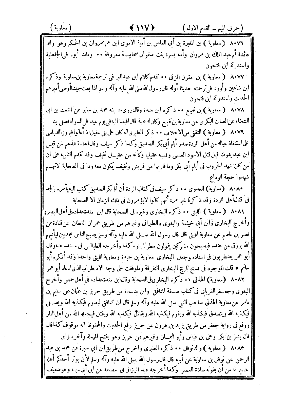 <117> معاوية بن المغيرة بن أبي العاص بن أمية الأموي بن عم مروان بن الحكم وهو والد عائشة أم عبد الملك بن مروان وأمه بسرة بنت صفوان صحابية معروفة ومات أبوه في الجاهلية واستدركه بن فتحون معاوية بن مقرن المزني تقدم كلام بن عبد البر في ترجمة معاوية وذكره بن شاهين وأورد في ترجمته حديثا أوله كان رسول الله صلى الله عليه وسلم إذا بعث جيشا أوصى أميرهم الحديث واستدركه بن فتحون معاوية بن نفيع ذكره بن منده وقال روى حديثه محمد بن جابر عن أشعث بن أبي الشعثاء عن الصلت البكري عن معاوية بن نقيع وكان له صحبة قال قال أقبلنا إليه في يوم عيد في السواد فصلى بنا معاوية الثقفي من الأحلاف ذكر الطبري أنه كان على بني عقيل إذ أعانوا فيروز الديلمي على استنقاذ عياله من أهل الردة صدر أيام أبي بكر الصديق وكذا ذكر سيف وقال إنه استنقذهم من قيس بن عبد يغوث قبل قتل الأسود العنسي ونسبه عقيليا وكأنه من عقيل ثقيف وقد تقدم التنبيه على أن من كان شهد الحروب في أيام أبي بكر وما قاربها من قريش وثقيف يكون معدودا في الصحابة لأنهم شهدوا حجة الوداع معاوية العذري ذكر سيف في كتاب الردة أن أبا بكر الصديق كتب إليه يأمره بالجد في قتال أهل الردة وقد ذكرنا غير مرة أنهم كانوا لا يؤمرون في ذلك الزمان إلا الصحابة معاوية الليثي ذكره البخاري وغيره في الصحابة قال بن منده عداده في أهل البصرة وأخرج البخاري وابن أبي خيثمة والبغوي والطبراني وغيرهم من طريق عمران القطان عن قتادة عن نصر بن عاصم عن معاوية الليثي قال قال رسول الله صلى الله عليه وسلم يصبح الناس مجدبين فيأتيهم الله برزق من عنده فيصبحون مشركين يقولون مطرنا بنوء كذا وأخرجه الطيالسي في مسنده عنه وقال أبو عمر يضطربون في إسناده وجعل البخاري معاوية بن حيدة ومعاوية الليثي واحدا وقد أنكره أبو حاتم قلت الموجود في نسخ تاريخ البخاري التفرقة وما وقفت على وجه الاضطراب الذي ادعاه أبو عمر معاوية الهذلي ذكره البخاري في الصحابة وقال بن منده عداده في أهل حمص وأخرج البغوي وجعفر الفريابي في كتاب صفة المنافق وابن منده من طريق حريز بن عثمان عن سليم بن عامر عن معاوية الهذلي صاحب النبي صلى الله عليه وسلم قال إن المنافق ليصوم فيكذبه الله ويصلي فيكذبه الله ويتصدق فيكذبه الله ويقوم فيكذبه الله ويقاتل فيكذبه الله ويقتل فيجعله الله من أهل النار ووقع في رواية جعفر من طريق يزيد بن هارون عن حريز رفع الحديث والمحفوظ أنه موقوف كذا قال بشر بن بكر وعلي بن عياش وأبو اليمان وغيرهم عن حريز وهو بفتح المهملة وآخره زاي معاوية والد نوفل ذكره الطبري وأخرج من طريق بن أبي سبرة عن محمد بن عبد الرحمن عن نوفل بن معاوية عن أبيه قال قال رسول الله صلى الله عليه وسلم لأن يوتر أحدكم أهله خير له من أن تفوته صلاة العصر وكذا أخرجه عبد الرزاق في مصنفه عن بن أبي سبرة وهو ضعيف §