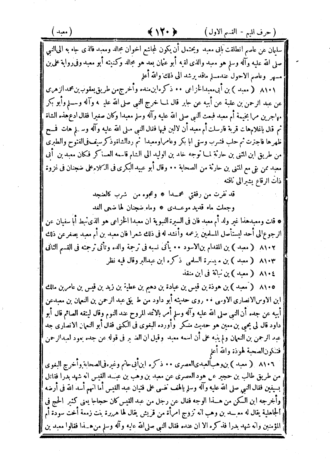 <120> سليمان عن عاصم انطلقت بأبي معبد ويحتمل أن يكون لمجاشع أخوان مجالد ومعبد فالذي جاء به إلى النبي صلى الله عليه وسلم هو معبد والذي لقيه أبو عثمان بعد هو مجالد وكنيته أبو معبد وفي رواية علي بن مسهر وعاصم الأحول وعند مسلم ما قد يرشد إلى ذلك والله أعلم معبد بن أبي معبد الخزاعي ذكره بن منده وأخرج من طريق يعقوب بن محمد الزهري عن عبد الرحمن بن عقبة عن أبيه عن جابر قال لما خرج النبي صلى الله عليه وسلم وأبو بكر مهاجرين مرا بخيمة أم معبد فبعث النبي صلى الله عليه وسلم معبدا وكان صغيرا فقال ادع هذه الشاة ثم قال يا غلام هات قربة فأرسلت أم معبدا أن لا لبن فيها فقال النبي صلى الله عليه وسلم هات فمسح ظهرها فاجترت ثم حلب فشرب وسقى أبا بكر وعامرا ومعبدا ثم رد الشاة وذكر سيف في الفتوح والطبري من طريق أن المثنى بن حارثة لما توجه خالد بن الوليد إلى الشام قاسمه العساكر فكان معبد بن أبي معبد ممن بقي مع المثنى بن حارثة من الصحابة وقال أبو عبيد البكري في الكلام على ضجنان في غزوة ذات الرقاع يشير إلى ناقته وقد نفرت من رفقتي محمد وعجوة من يثرب كالعنجد وجعلت ماء قديد موعدي وماء ضجنان لها ضحى الغد قلت ومعبد هذا غير ولد أم معبد فإن في السيرة النبوية إن معبدا الخزاعي هو الذي ثبط أبا سفيان عن الرجوع إلى أحد ليستأصل المسلمين بزعمه وأنشد له في ذلك شعرا فإن معبدا بن أم معبد يصغر عن ذلك معبد بن المقداد بن الأسود يأتي نسبه في ترجمة والده وتأتي ترجمته في القسم الثاني معبد بن ميسرة السلمي ذكره بن عبد البر وقال فيه نظر معبد بن نباتة في بن منقذ معبد بن هوذة بن قيس بن عبادة بن دهيم بن عطية بن زيد بن قيس بن عامر بن مالك بن أوس الأنصاري الأوسي روى حديثه أبو داود من طريق عبد الرحمن بن النعمان بن معبد عن أبيه عن جده أن النبي صلى الله عليه وسلم أمر بالإثمد المروح عند النوم وقال ليتقه الصائم قال أبو داود قال لي يحيى بن معين هو حديث منكر وأورده البغوي في الكنى فقال أبو النعمان الأنصاري جد عبد الرحمن بن النعمان ولم ينبه على أن اسمه معبد وقيل إن الضمير في قوله عن جده يعود لعبد الرحمن فتكون الصحبة لهودة والله اعلم معبد بن وهب العبدي العصري ذكره بن أبي حاتم وغيره في الصحابة وأخرج البغوي من طريق طالب بن حجير عن هود العصري عن معبد بن وهب بن عبد القيس أنه شهد بدرا فقاتل بسيفين فقال النبي صلى الله عليه وسلم يا لهف نفسي على فتيان عبد القيس أما إنهم أسد الله في أرضه وأخرجه بن السكن من هذا الوجه فقال عن رجل من عبد القيس كان حجاجا يعني كثير الحج في الجاهلية يقال له معبد بن وهب أنه تزوج امرأة من قريش يقال لها هويرة بنت زمعة أخت سودة أم المؤمنين وأنه شهد بدرا فذكره إلا أن عنده فقال النبي صلى الله عليه وسلم من هذا فقالوا معبد بن §