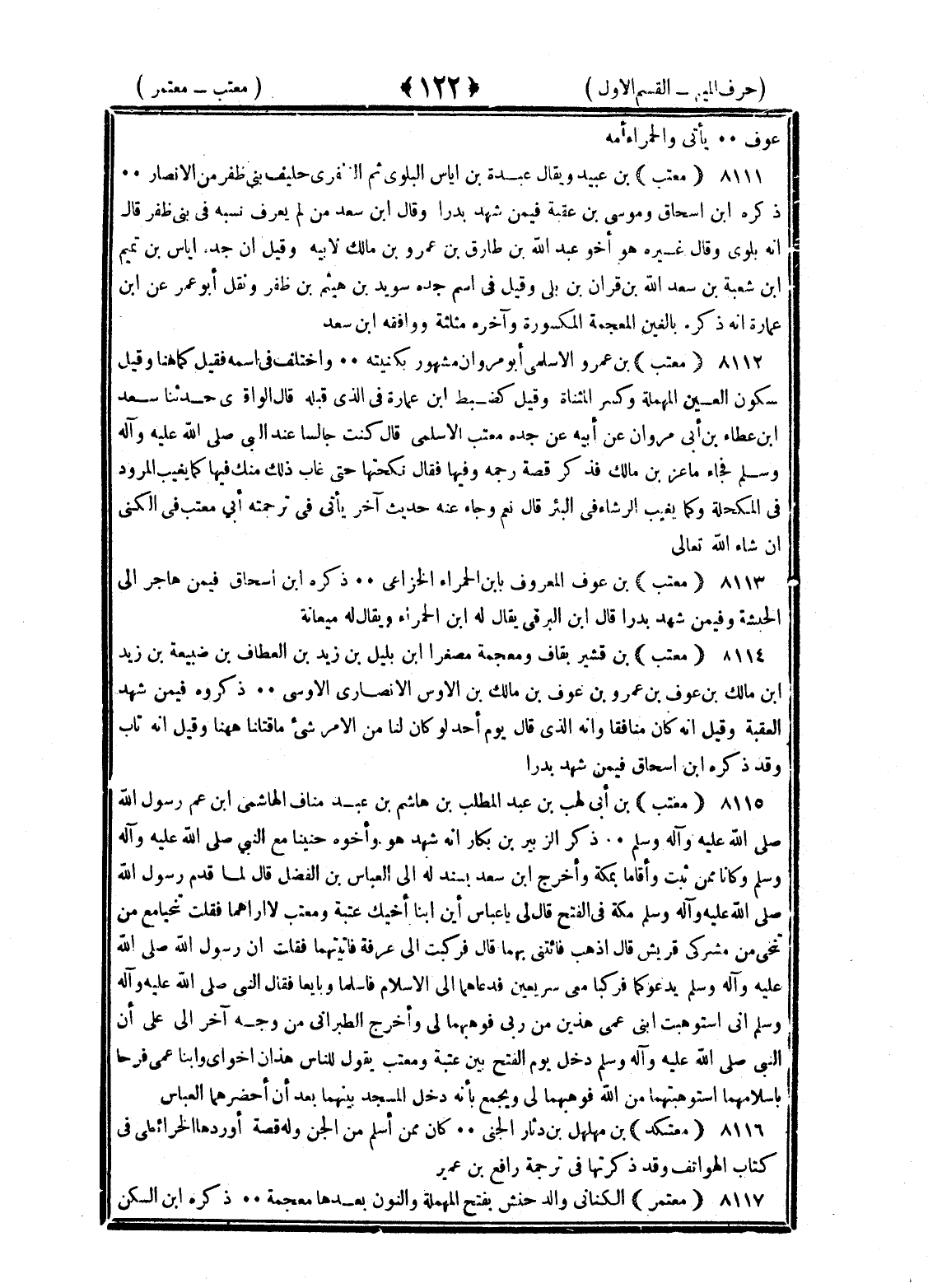<122> عوف يأتي والحمراء أمه معتب بن عبيد ويقال عبدة بن إياس البلوي ثم الظفري حليف بني ظفر من الأنصار ذكره بن إسحاق وموسى بن عقبة فيمن شهد بدرا وقال بن سعد من لم يعرف نسبه في بني ظفر قال إنه بلوي وقال غيره هو أخو عبد الله بن طارق بن عمرو بن مالك لأمه وقيل إن جده إياس بن تميم بن شعبة بن سعد الله بن فران من بلي وقيل وفي اسم جده سويد بن هيثم بن ظفر ونقل أبو عمر عن بن عمارة أنه ذكر بالغين المعجمة المكسورة وآخره مثلثة ووافقه بن سعد معتب بن عمرو الأسلمي أبو مروان مشهور بكنيته واختلف في اسمه فقيل كما هنا وقيل بسكون العين المهملة وكسر المثناة وقيل كضبط بن عمارة في الذي قبله قال الواقدي حدثنا سعد بن عطاء بن أبي مروان عن أبيه عن جده معتب الأسلمي قال كنت جالسا عند النبي صلى الله عليه وسلم فجاء ماعز بن مالك فذكر قصة رجمه وفيها فقال نكحتها حتى غاب ذلك منك فيها كما يغيب المرود في المكحلة وكما يغيب الرشاء في البئر قال نعم وجاء عنه حديث آخر يأتي في ترجمة أبي معتب في الكنى إن شاء الله تعالى معتب بن عوف المعروف بابن الحمراء الخزاعي ذكره بن إسحاق فيمن هاجر إلى الحبشة وفيمن شهد بدرا قال بن البرقي يقال له بن الحمراء ويقال له هيعانة معتب بن قشير بقاف ومعجمة مصغرا بن مليل بن زيد بن العطاف بن ضبيعة بن زيد بن مالك بن عوف بن عمرو بن عوف بن الأوس الأنصاري الأوسي ذكره فيمن شهد العقبة وقيل إنه كان منافقا وإنه الذي قال يوم أحد لو كان لنا من الأمر شيء ما قتلنا ها هنا وقيل إنه تاب وقد ذكره بن إسحاق فيمن شهد بدرا معتب بن أبي لهب بن عبد المطلب بن هاشم بن عبد مناف الهاشمي بن عم رسول الله صلى الله عليه وسلم ذكر الزبير بن بكار أنه شهد هو وأخوه حنينا مع النبي صلى الله عليه وسلم وكانا ممن ثبت وأقاما بمكة وأخرج بن سعد بسند له إلى العباس بن الفضل قال لما قدم رسول الله صلى الله عليه وسلم مكة في الفتح قال لي يا عباس أين ابنا أخيك عتبة ومعتب لأراهما فقلت تنحيا مع من تنحى من مشركي قريش قال اذهب فائتني بهما قال فركبت إلى عرفة فأتيتهما فقلت إن رسول الله صلى الله عليه وسلم يدعو كما فركبا معي سريعين فدعاهما إلى الإسلام فأسلما وبايعا فقال النبي صلى الله عليه وسلم إني استوهبت ابني عمي هذين من ربي فوهبهما لي وأخرج الطبراني من وجه آخر إلى علي أن النبي صلى الله عليه وسلم دخل يوم الفتح بين عتبة ومعتب يقول للناس هذان أخواي وابنا عمي فرحا بإسلامهما استوهبتهما من الله فوهبهما لي ويجمع بأنه دخل المسجد بينهما بعد أن أحضرهما العباس معتكد بن مهلهل بن دثار الجني وكان ممن أسلم من الجن وله قصة أوردها الخرائطي في كتاب الهواتف وقد ذكرتها في ترجمة رافع بن عمير معتمر الكناني والد حنش بفتح المهملة والنون بعدها معجمة ذكره بن السكن §
