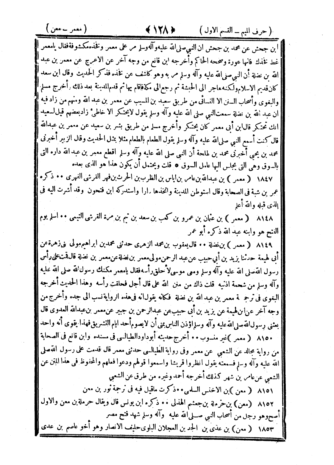 <128> بن جحش عن محمد بن جحش أن النبي صلى الله عليه وسلم مر على معمر وفخذه مكشوفة فقال غط فخذك فإنها عورة وصححه الحاكم وأخرجه بن قانع من وجه آخر عن الأعرج عن معمر بن عبد الله بن نضلة أن النبي صلى الله عليه وسلم مر به وهو كاشف عن فخذه فذكر الحديث وقال بن سعد كان قديم الإسلام ولكنه هاجر إلى الحبشة ثم رجع إلى مكة فأقام بها ثم قدم المدينة بعد ذلك وأخرج مسلم والبغوي وأصحاب السنن إلا النسائي من طريق سعيد بن المسيب عن معمر بن عبد الله ومنهم من زاد فيه بن عبد الله بن نضلة سمعت النبي صلى الله عليه وسلم يقول لا يحتكر إلا خاطئ زاد بعضهم قيل لسعيد إنك تحتكر قال بن أبي معمر كان يحتكر وأخرج مسلم من طريق بشر بن سعيد عن معمر بن عبد الله قال كنت أسمع النبي صلى الله عليه وسلم يقول الطعام بالطعام مثلا بمثل الحديث وقال الزبير أخبرني محمد بن يحيى أخبرني محمد بن طلحة أن النبي صلى الله عليه وسلم أقطع معمر بن عبد الله داره التي بالسوق وهي التي يجلس إليها عامل السوق قلت ويحتمل أن يكون هذا هو الذي بعده معمر بن عبد الله بن عامر بن إياس بن الظرب بن الحارث بن فهر القرشي الفهري ذكره عمر بن شبة في الصحابة وقال استوطن المدينة واتخذها دارا واستدركه بن فتحون وقد أشرب إليه في الذي قبله والله أعلم معمر بن عثمان بن عمرو بن كعب بن سعد بن تيم بن مرة القرشي التيمي أسلم يوم الفتح هو وابنه عبد الله ذكره أبو عمر معمر بن نضلة قال يعقوب بن محمد الزهري حدثني محمد بن إبراهيم مولى بني زهرة عن بن لهيعة حدثنا يزيد بن أبي حبيب عن عبد الرحمن مولى معمر بن نضلة قال قمت على رأس رسول الله صلى الله عليه وسلم ومعي موسى لأحلق رأسه فقال يا معمر مكنك رسول الله صلى الله عليه وسلم من شحمة أذنيه قلت ذاك من منن الله علي قال أجل فحلقت رأسه وهذا الحديث أخرجه البغوي في ترجمة معمر بن عبد الله بن نضلة فكأنه يقول إنه في هذه الرواية نسب إلى جده وأخرج من وجه آخر عن بن لهيعة عن يزيد بن أبي حبيب عن عبد الرحمن بن جبير عن معمر بن عبد الله العدوي قال بعثني رسول الله صلى الله عليه وسلم أوذن الناس بمنى ألا يصوم أحد أيام التشريق فهذا يقوي أنه واحد معمر غير منسوب أخرج حديثه أبو داود الطيالسي في مسنده وابن قانع في الصحابة من رواية مجالد عن الشعبي عن معمر وفي رواية الطيالسي حدثني معمر قال قدمت على رسول الله صلى الله عليه وسلم فسمعه يقول انظروا قريشا واسمعوا قولهم ودعوا فعلهم والمحفوظ في هذا المتن عن الشعبي عن عامر بن شهر كذلك أخرجه أحمد وغيره من طريق الشعبي معن بن الأخنس السلمي ذكرت ما قيل فيه في ترجمة ثور بن معن معن بن حرملة بن جعشم الهذلي ذكره بن يونس قال ويقال حرملة بن معن والأول أصح وهو رجل من أصحاب النبي صلى الله عليه وسلم شهد فتح مصر معن بن عدي بن الجد بن العجلان البلوي حليف الأنصار وهو أخو عاصم بن عدي §