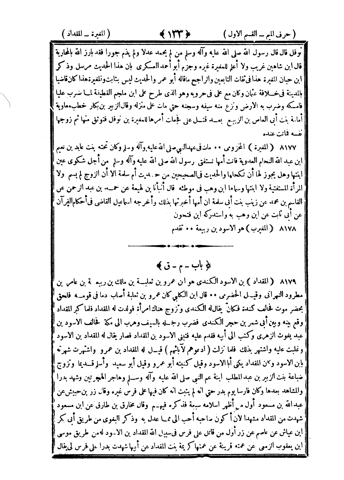 <133> قال قال رسول الله صلى الله عليه وسلم من لم يحمد عدلا ولم يذم جورا فقد بارز الله بالمحاربة وقال بن شاهين غريب ولا أعلم للمغيرة غيره وجزم أبو أحمد العسكري بأن هذا الحديث مرسل وذكر بن حبان المغيرة هذا في ثقات التابعين والراجح ما قاله أبو عمر والحديث ليس بثابت والمغيرة هذا كان قاضيا بالمدينة في خلافة عثمان ثم كان مع علي في حروبه وهو الذي طرح على بن ملجم القطيفة لما ضرب عليا فأمسكه وضرب به الأرض ونزع منه سيفه وسجنه حتى مات على منزلته وقال الزبير بن بكار وخطب معاوية أمامة بنت أبي العاص بن الربيع بعد قتل علي فجعلت أمرها للمغيرة بن نوفل فتوثق منها ثم زوجها نفسه فماتت عنده المغيرة المخزومي مات في عهد النبي صلى الله عليه وسلم وكانت تحته بنت عائذ بن نعيم بن عبد الله النحام العدوية فأتت أمها تستفتي رسول الله صلى الله عليه وسلم من أجل شكوى عين ابنتها وهل يجوز لها أن تكحلها والحديث في الصحيحين من حديث أم سلمة إلا أن الزوج لم يسم ولا المرأة المستفتية ولا ابنتها وسماها بن وهب في موطئه قال أنبأنا بن لهيعة عن محمد بن عبد الرحمن عن القاسم بن محمد عن زينب بنت أبي أسامة أن أمها أخبرتها بذلك وأخرجه إسماعيل القاضي في أحكام القرآن عن أبي ثابت عن بن وهب به واستدركه بن فتحون المغترب هو الأسود بن ربيعة تقدم الميم بعدها القاف المقداد بن الأسود الكندي هو بن عمرو بن ثعلبة بن مالك بن ربيعة بن عامر بن مطرود البهراني وقيل الحضرمي قال بن الكلبي كان عمرو بن ثعلبة أصاب دما في قومه فلحق بحضرموت فحالف كندة فكان يقال له الكندي وتزوج هناك امرأة فولدت له المقداد فلما كبر المقداد وقع بينه وبين أبي شمر بن حجر الكندي فضرب رجله بالسيف وهرب إلى مكة فحالف الأسود بن عبد يغوث الزهري وكتب إلى أبيه فقدم عليه فتبنى الأسود المقداد فصار يقال المقداد بن الأسود وغلبت عليه واشتهر بذلك فلما نزلت ادعوهم لآبائهم قيل له المقداد بن عمرو واشتهرت شهرته بابن الأسود وكان المقداد يكنى أبا الأسود وقيل كنيته أبو عمر وقيل أبو سعيد وأسلم قديما وتزوج ضباعة بنت الزبير بن عبد المطلب ابنة عم النبي صلى الله عليه وسلم وهاجر الهجرتين وشهد بدرا والمشاهد بعدها وكان فارسا يوم بدر حتى إنه لم يثبت أنه كان فيها على فرس غيره وقال زر بن حبيش عن عبد الله بن مسعود أول من أظهر إسلامه سبعة فذكر فيهم وقال مخارق بن طارق عن بن مسعود شهدت مع المقداد مشهدا لأن أكون صاحبه أحب إلي مما عدل به وذكر البغوي من طريق أبي بكر بن عياش عن عاصم عن زر أول من قاتل على فرس في سبيل الله المقداد بن الأسود ومن طريق موسى بن يعقوب الزمعي عن عمته قريبة عن عمتها كريمة بنت المقداد عن أبيها شهدت بدرا على فرس لي يقال §