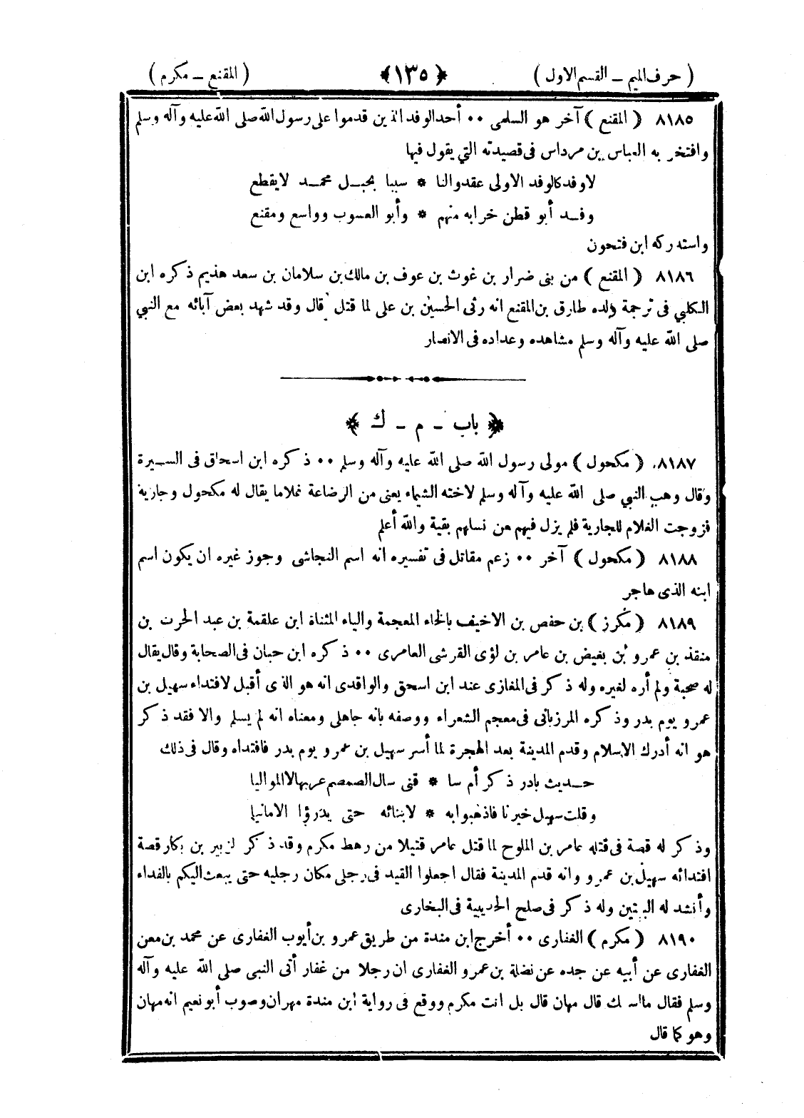 <135> المقنع آخر هو السلمي أحد الوفد الذين قدموا على رسول الله صلى الله عليه وسلم من بني سليم وافتخر به العباس بن مرداس في قصيدته التي يقول فيها لا وفد كالوفد الألى عقدوا لنا سببا بحبل محمد لا يقطع وفد أبو قطن حزابة منهم وأبو الغيوث وواسع ومقنع واستدركه بن فتحون المقنع من بني ضرار بن غوث بن عوف بن مالك بن سلامان بن سعد هذيم ذكر بن الكلبي في ترجمة ولده طارق بن المقنع أنه رثى الحسين بن علي لما قتل قال وقد شهد بعض آبائه مع النبي صلى الله عليه وسلم مشاهده وعداده في الأنصار الميم بعدها الكاف مكحول مولى رسول الله صلى الله عليه وسلم ذكره بن إسحاق في السيرة وقال وهب النبي صلى الله عليه وسلم لأخته الشيماء يعني من الرضاعة غلاما يقال له مكحول وجارية فزوجت الغلام للجارية فلم يزل فيهم من نسلهم بقية والله أعلم مكحول آخر زعم مقاتل في تفسيره أنه اسم النجاشي وجوز غيره أن يكون اسم ابنه الذي هاجر مكرز بن حفص بن الأخيف بالخاء المعجمة والياء المثناة بن علقمة بن عبد الحارث بن منقذ بن عمرو بن بغيض بن عامر بن لؤي القرشي العامري ذكره بن حبان في الصحابة وقال يقال له صحبة ولم أره لغيره وله ذكر في المغازي في عند بن إسحاق والواقدي أنه هو الذي أقبل لافتداء سهيل بن عمرو يوم بدر وذكره المرزباني في معجم الشعراء ووصفه بأنه جاهلي ومعناه أنه لم يسلم وإلا فقد ذكر هو أنه أدرك الإسلام وقدم المدينة بعد الهجرة لما أسر سهيل بن عمرو يوم بدر فافتداه وقال في ذلك بأذواد كرام سبا فتى ينال الصميم عربها لا المواليا وقلت سهيل خيرنا فاذهبوا به لأبنائه حتى تديروا الأمانيا وذكر له قصة في قتله عامر بن الملوح لما قتل عامر قتيلا من رهط مكرز وقد ذكر الزبير بن بكار قصة افتدائه سهيل بن عمرو وأنه قدم المدينة فقال اجعلوا القيد في رجلي مكان رجليه حتى يبعث إليكم بالفداء وأنشد له البيتين وله ذكر في صلح الحديبية في البخاري مكرم الغفاري أخرج بن منده من طريق عمرو بن أيوب الغفاري عن محمد بن معن عن أبيه عن جده عن نضلة بن عمرو الغفاري أن رجلا من غفار أتى النبي صلى الله عليه وسلم فقال ما اسمك قال مهان قال بل أنت مكرم ووقع في رواية بن منده مهران وصوب أبو نعيم أنه مهان وهو كما قال §