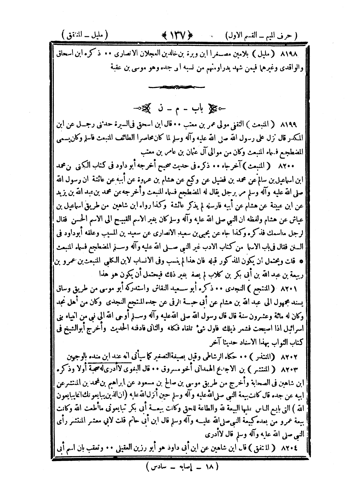 <137> مليل بلامين مصغرا بن وبرة بن خالد بن العجلان الأنصاري ذكره بن إسحاق والواقدي وغيرهما فيمن شهد بدرا ومنهم من نسبه إلى جده وهو موسى بن عقبة الميم بعدها النون المنبعث الثقفي مولى عمر بن معتب قال بن إسحاق في السيرة حدثني رجل عن بن المنكدر قال نزل على رسول الله صلى الله عليه وسلم لما كان محاصرا الطائف المنبعث فأسلم وكان يسمى المضطجع فسماه المنبعث وكان من موالي آل عثمان بن عامر بن معتب المنبعث آخر جاء ذكره في حديث صحيح أخرجه أبو داود في كتاب الكنى عن محمد بن إسماعيل بن سالم عن محمد بن فضيل ووكيع عن هشام بن عروة عن أبيه عن عائشة أن رسول الله صلى الله عليه وسلم مر برجل يقال له المضطجع فسماه المنبعث وأخرجه عن محمد بن عبد الله بن يزيد عن بن عيينة عن هاشم عن أبيه فأرسله ولم يذكر عائشة وكذا رواه بن شاهين من طريق إسماعيل بن عياش عن هشام ولفظه أن النبي صلى الله عليه وسلم كان يغير الاسم القبيح إلى الاسم الحسن فقال لرجل ما اسمك فذكره وكذا جاء عن يحيى بن سعيد الأنصاري عن سعيد بن المسيب وعلقه أبو داود في السنن فقال في باب الأسماء من كتاب الأدب غير النبي صلى الله عليه وسلم المضطجع فسماه المنبعث قلت ويحتمل ان يكون المذكور قبله فإن هذا لم ينسب وفي الأنساب لابن الكلبي المنبعث بن عمرو بن ربيعة بن عبد الله بن أبي بكر بن كلاب لم يصفه بغير ذلك فيحتمل أن يكون هو هذا المنتجع النجدي ذكره أبو سعيد النقاش واستدركه أبو موسى من طريق وساق بسند مجهول إلى عبد الله بن هشام عن أبي حبة الرقي عن جده المنتجع النجدي وكان من أهل نجد وكان له مائة وعشرون سنة قال قال رسول الله صلى الله عليه وسلم أوحى الله إلى نبي من أنبياء بني إسرائيل إذا أصبحت فشمر ذيلك فأول شيء تلقاه فكله والثاني فادفنه الحديث وأخرج أبو الشيخ في كتاب الثواب بهذا الإسناد حديثا آخر المنتذر حكاه الرشاطي وقيل بصيغة التصغير كما سيأتي أنه عند بن منده بالوجهين المنتشر بن الأجدع الهمداني أخو مسروق قال البغوي لا أدري له صحبة أو لا وذكره بن شاهين في الصحابة وأخرج من طريق موسى بن صالح عن مسعود عن إبراهيم بن محمد بن المنتشر عن أبيه عن جده قال كانت بيعة النبي صلى الله عليه وسلم حين أنزل الله عليه إن الذين يبايعونك إنما يبايعون الله التي بايع الناس عليها البيعة لله والطاعة للحق وكانت بيعة أبي بكر تبايعوني ما أطعت الله وكانت بيعة عمر ومن بعده كبيعة النبي صلى الله عليه وسلم قال بن أبي حاتم قلت لأبي معشر المنتشر رأى النبي صلى الله عليه وسلم قال لا أدري المنتفق قال بن شاهين عن بن أبي داود هو أبو رزين العقيلي وتعقب بأن اسم أبي §