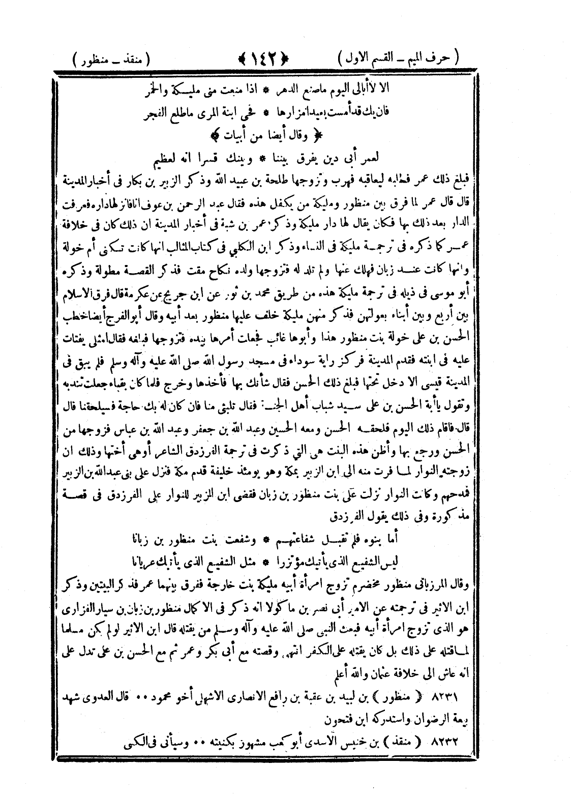 <142> ألا لا أبالي اليوم ما صنع الدهر إذا منعت مني مليكة والخمر فإن تك قد أمست بعيدا مزارها فحي ابنة المري ما طلع الفجر وقال أيضا من أبيات لعمر أبي دين يفرق بيننا وبينك قسرا إنه لعظيم فبلغ ذلك عمر فطلبه ليعاقبه فهرب وتزوجها طلحة بن عبيد الله وذكر الزبير بن بكار في أخبار المدينة قال قال عمر لما فرق بين منظور ومليكة من يكفل هذه فقال عبد الرحمن بن عوف أنا فأنزلها داره فعرفت الدار بعد ذلك بها فكان يقال لها دار مليكة وذكر عمر بن شبة في أخبار المدينة أن ذلك كان في خلافة عمر كما سأذكره في ترجمة مليكة في النساء وذكر بن الكلبي في كتاب المثالب أنها كانت تكنى أم خولة وأنها كانت عند زبان فهلك عنها ولم تلد له فتزوجها ولده نكاح مقت فذكر القصة مطولة وذكر أبو موسى في ذيله في ترجمة مليكة هذه من طريق محمد بن ثور عن بن جريج عن عكرمة قال فرق الإسلام بين أربع وبين أبناء بعولتهن فذكر منهن مليكة خلف عليها منظور بعد أبيه وقال أبو الفرج أيضا خطب الحسن بن علي خولة بنت منظور هذا وأبوها غائب فجعلت أمرها بيده فتزوجها فبلغه فقال أمثلي يفتات عليه في ابنته فقدم المدينة فركز راية سوداء في مسجد رسول الله صلى الله عليه وسلم فلم يبق في المدينة قيسي إلا دخل تحتها فبلغ ذلك الحسن فقال شأنك بها فأخذها وخرج فلما كان بقباء جعلت تندبه وتقول يا أبت الحسن بن علي سيد شباب أهل الجنة فقال تلبثي هنا فإن كان له بك حاجة فسيلحقنا قال فأقام ذلك اليوم فلحقه الحسن ومعه الحسين وعبد الله بن جعفر وعبد الله بن عباس فزوجها من الحسن ورجع بها وأظن هذه البنت هي التي ذكرت في ترجمة الفرزدق الشاعر أو هي أختها وذلك أن زوجته النوار لما فرت منه إلى بن الزبير بمكة وهو يومئذ خليفة قدم مكة فنزل على بني عبد الله بن الزبير فمدحهم وكانت النوار نزلت على بنت منظور بن زبان فقضى بن الزبير للنوار على الفرزدق في قصة مذكورة وفي ذلك يقول الفرزدق أما بنوه فلم تقبل شفاعتهم وشفعت بنت منظور بن زبانا ليس الشفيع الذي يأتيك مؤتزرا مثل الشفيع الذي يأتيك عريانا وقال المرزباني منظور مخضرم تزوج امرأة أبيه مليكة بنت خارجة ففرق بينهما عمر فذكر البيتين وذكر بن الأثير في ترجمته عن الأمير أبي نصر بن ماكولا أنه ذكر في الإكمال منظور بن زبان بن سنان الفزاري هو الذي تزوج امرأة أبيه فبعث النبي صلى الله عليه وسلم من يقتله قال بن الأثير لو لم يكن مسلما لما قتله على ذلك بل كان يقتله على الكفر انتهى وقصته مع أبي بكر وعمر ثم مع الحسن بن علي تدل على أنه عاش إلى خلافة عثمان والله أعلم منظور بن لبيد بن عقبة بن رافع الأنصاري الأشهلي أخو محمود قال العدوي شهد بيعة الرضوان واستدركه بن فتحون منقذ بن خنيس الأسدي أبو كعب مشهور بكنيته وسيأتي في الكنى §
