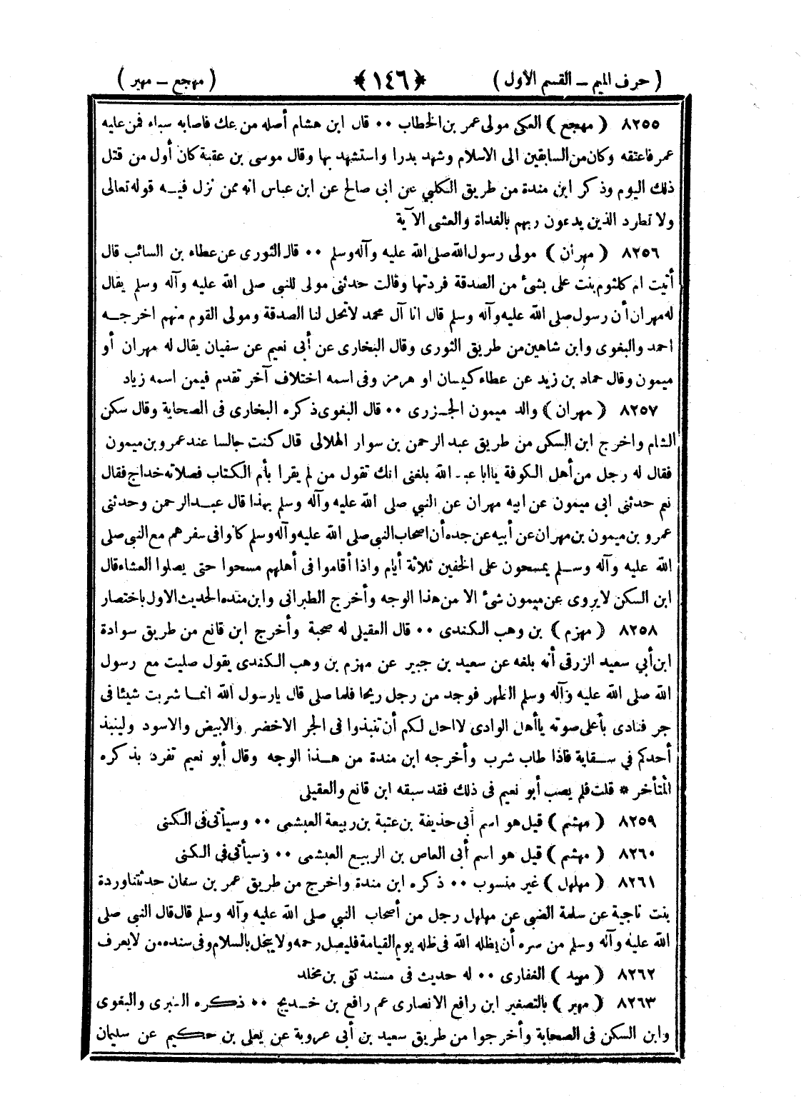 <146> مهجع العكي مولى عمر بن الخطاب قال بن هشام أصله من عك فأصابه سباء فمن عليه عمر فأعتقه وكان من السابقين إلى الإسلام وشهد بدرا واستشهد بها وقال موسى بن عقبة كان أول من قتل ذلك اليوم وذكر بن منده من طريق الكلبي عن أبي صالح عن بن عباس أنه ممن نزل فيه قوله تعالى ولا تطرد الذين يدعون ربهم بالغداة والعشي الآية مهدي عبد الرحمن ذكره بن عائذ في البكائين في غزوة تبوك نقله بن سيد الناس مهران مولى رسول الله صلى الله عليه وسلم قال الثوري عن عطاء بن السائب قال أتيت أم كلثوم بنت علي بشيء من الصدقة فردتها وقالت حدثني مولى للنبي صلى الله عليه وسلم يقال له مهران أن رسول الله صلى الله عليه وسلم قال إنا آل محمد لا تحل لنا الصدقة ومولى القوم منهم أخرجه أحمد والبغوي وابن شاهين من طريق الثوري وقال البخاري عن أبي نعيم عن سفيان يقال له مهران أو ميمون وقال حماد بن زيد عن عطاء كيسان أو هرمز وفي اسمه اختلاف آخر تقدم فيمن اسمه زياد مهران والد ميمون الجزري قال البغوي ذكره البخاري في الصحابة وقال سكن الشام وأخرج بن السكن من طريق عبد الرحمن بن سوار الهلالي قال كنت جالسا عند عمرو بن ميمون فقال له رجل من أهل الكوفة يا أبا عبد الله بلغني أنك تقول من لم يقرأ بأم الكتاب فصلاته خداج فقال نعم حدثني أبي ميمون عن أبيه مهران عن النبي صلى الله عليه وسلم بهذا قال عبد الرحمن وحدثني عمرو بن ميمون بن مهران عن أبيه عن جده أن أصحاب النبي صلى الله عليه وسلم كانوا في سفرهم مع النبي صلى الله عليه وسلم يمسحون على الخفين ثلاثة أيام وإذا أقاموا في أهلهم مسحوا حتى يصلوا العشاء قال بن السكن لا يروي عن ميمون شيء إلا من هذا الوجه وأخرج الطبراني وابن منده الحديث الأول باختصار مهزم بن وهب الكندي قال العقيلي له صحبة وأخرج بن قانع من طريق سوادة بن أبي سعيد الزرقي أنه بلغه عن سعيد بن جبير عن مهزم بن وهب الكندي يقول صليت مع رسول الله صلى الله عليه وسلم الظهر فوجد من رجل ريحا فلما صلى قال يا رسول الله إنما شربت شيئا في جر فنادى بأعلى صوته يا أهل الوادي لا أحل لكم أن تنبذوا في الجر الأخضر والأبيض والأسود ولينبذ أحدكم في سقائه فإذا طاب شرب وأخرجه بن منده من هذا الوجه وقال أبو نعيم تفرد بذكره المتأخر قلت فلم يصب أبو نعيم في ذلك فقد سبقه بن قانع والعقيلي مهشم قيل هو اسم أبي حذيفة بن عتبة بن ربيعة العبشمي وسيأتي في الكنى مهشم قيل هو اسم أبي العاص بن الربيع العبشمي وسيأتي في الكنى مهلهل غير منسوب ذكره بن منده وأخرج من طريق عمر بن سنان حدثتنا وردة بنت ناجية عن سلمة الضبي عن مهلهل رجل من أصحاب النبي صلى الله عليه وسلم قال قال النبي صلى الله عليه وسلم من سره أن يظله الله في ظله يوم القيامة فليصل رحمه ولا يبخل بالسلام وفي سنده من لا يعرف مهند الغفاري له حديث في مسند بقي بن مخلد مهير بالتصغير بن رافع الأنصاري عم رافع بن خديج ذكره الطبري والبغوي وابن السكن في الصحابة وأخرجوا من طريق سعيد بن أبي عروبة عن يعلى بن حكيم عن سليمان §
