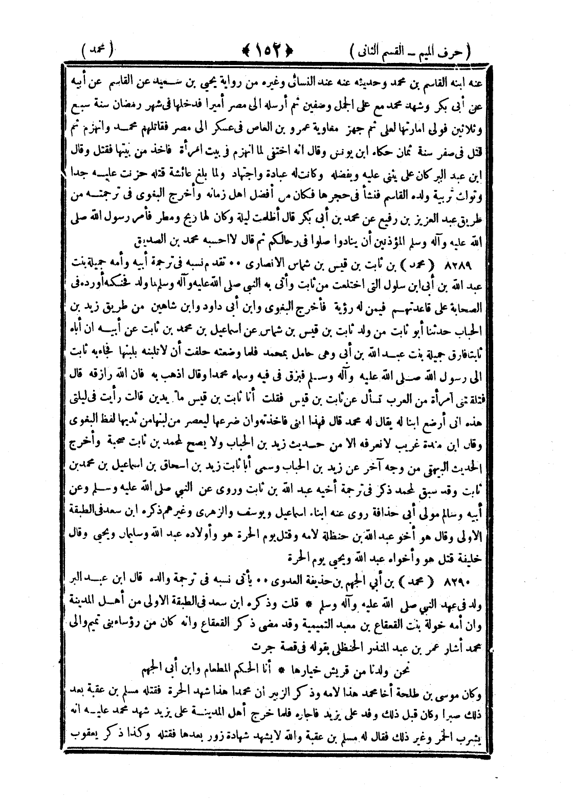 <152> عنه ابنه القاسم بن محمد وحديثه عنه عند النسائي وغيره من رواية يحيى بن سعيد عن القاسم عن أبيه عن أبي بكر وشهد محمد مع الجمل وصفين ثم أرسله إلى مصر أميرا فدخلها في شهر رمضان سنة سبع وثلاثين فولى إمارتها لعلي ثم جهز معاوية عمرو بن العاص في عسكر إلى مصر فقاتلهم محمد وانهزم ثم قتل في صفر سنة ثمان حكاه بن يونس وقال إنه اختفى لما انهزم في بيت امرأة فأخذ من بيتها فقتل وقال بن عبد البر كان علي يثني عليه ويفضله وكانت له عبادة واجتهاد ولما بلغ عائشة قتله حزنت عليه جدا وتولت تربية ولده القاسم فنشأ في حجرها فكان من أفضل أهل زمانه وأخرج البغوي في ترجمته من طريق عبد العزيز بن رفيع عن محمد بن أبي بكر قال أظلمت ليلة وكان لها ريح ومطر فأمر رسول الله صلى الله عليه وسلم المؤذنين أن ينادوا صلوا في رحالكم ثم قال لا أحسبه محمد بن الصديق محمد بن ثابت بن قيس بن شماس الأنصاري تقدم نسبه في ترجمة أبيه وأمه جميلة بنت عبد الله بن أبي بن سلول التي اختلعت من ثابت وأتى به النبي صلى الله عليه وسلم لما ولد فحنكه أورده في الصحابة على قاعدتهم فيمن له رؤية فأخرج البغوي وابن أبي داود وابن شاهين من طريق زيد بن الحباب حدثنا أبو ثابت من ولد ثابت بن قيس بن شماس عن إسماعيل بن محمد بن ثابت عن أبيه أن أباه ثابتا فارق جميلة بنت عبد الله بن أبي وهي حامل بمحمد فلما وضعته حلفت أن لا تلبنه بلبنها فجاء به ثابت إلى رسول الله صلى الله عليه وسلم فبزق في فيه وسماه محمدا وقال اذهب به فإن الله رازقه قال فتلقتني امرأة من العرب تسأل عن ثابت بن قيس فقلت أنا ثابت بن قيس ما تريدين قالت رأيت في ليلتي هذه أني أرضع ابنا يقال له محمد قال فهذا ابني فأخذته وإن ضرعها ليعصر من لبنها من ثديها لفظ البغوي وقال بن منده غريب لا نعرفه إلا من حديث زيد بن الحباب ولا يصح لمحمد بن ثابت صحبة وأخرج الحديث البيهقي من وجه آخر عن زيد بن الحباب وسمى أبا ثابت زيد بن إسحاق بن إسماعيل بن محمد بن ثابت وقد سبق لمحمد ذكر في ترجمة أخيه عبد الله بن ثابت وروى عن النبي صلى الله عليه وسلم عن أبيه وسالم مولى أبي حذيفة روى عنه ابناه إسماعيل ويوسف والزهري وغيرهم ذكره بن سعد في الطبقة الأولى وقال هو أخو عبد الله بن حنظلة لأمه وقتل يوم الحرة هو وأولاده عبد الله وسليمان ويحيى وقال خليفة قتل هو وأخواه عبد الله ويحيى يوم الحرة محمد بن أبي الجهم بن حذيفة العدوي يأتي نسبه في ترجمة والده قال بن عبد البر ولد في عهد النبي صلى الله عليه وسلم قلت وذكره بن سعد في الطبقة الأولى من أهل المدينة وأن أمه خولة بنت القعقاع بن معبد التميمية وقد مضى ذكر القعقاع وأنه كان من رؤساء بني تميم وإلى محمد أشار عمر بن عبد المنذر الحنظلي بقوله في قصة جرت نحن ولدنا من قريش خيارها أبا الحكم المطعام وابن أبي الجهم وكان موسى بن طلحة أخا محمد هذا لأمه وذكر الزبير أن محمدا هذا شهد الحرة فقتله مسلم بن عقبة بعد ذلك صبرا وكان قبل ذلك وفد على يزيد فأجاره فلما خرج أهل المدينة على يزيد شهد محمد عليه أنه يشرب الخمر وغير ذلك فقال له مسلم بن عقبة والله لا يشهد شهادة زور بعدها فقتله وكذا ذكر يعقوب §