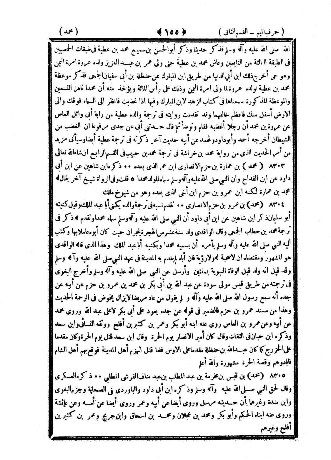 <155> الله صلى الله عليه وسلم فذكر حديثا وذكر أبو الحسن بن سميع محمد بن عطية في طبقات الحمصيين في الطبقة الثالثة من التابعين وعاش محمد بن عطية حتى ولي عمر بن عبد العزيز ولده عروة إمرة اليمن وهو حي أخرج ذلك بن أبي الدنيا من طريق بن المبارك عن حنظلة بن أبي سفيان الجمحي فذكر موعظة محمد بن عطية لولده عروة لما ولي إمرة اليمن وذلك على رأس المائة ويؤخذ منه أن محمدا ناهز التسعين والموعظة المذكورة سمعناها في كتاب الزهد لابن المبارك وفيها إذا غضبت فانظر إلى السماء فوقك وإلى الأرض أسفل منك فأعظم فالقها وقد تقدمت روايته في ترجمة والده عطية من رواية أبي وائل العاص عن عروة بن محمد أن رجلا أغضبه فقام وتوضأ ثم قال حدثني أبي عن جدي مرفوعا أن الغضب من الشيطان أخرجه أحمد وأبو داود ولمحمد عن أبيه حديث آخر ذكرته في تجربة عطية أيضا وسيأتي مزيد من أمر الحديث الذي من رواية محمد بن خراشة في ترجمة محمد بن حبيب في القسم الرابع إن شاء الله تعالى محمد بن عمارة بن حزم الأنصاري بن عم الذي بعده ذكره بن شاهين عن بن أبي داود عن القداح وأن النبي صلى الله عليه وسلم سماه لما ولد محمدا قلت وفي الرواة شيخ آخر يقال له محمد بن عمارة ولكنه بن عمرو بن حزم بن أخي الذي بعده وهو من شيوخ مالك محمد بن عمرو بن حزم الأنصاري تقدم نسبه في ترجمة والده يكنى أبا عبد الملك وقيل كنيته أبو سليمان ذكره بن شاهين عن بن أبي داود أن النبي صلى الله عليه وسلم سماه محمدا وتقدم له ذكر في ترجمة محمد بن حطاب الجمحي وقال الواقدي ولد سنة عشر من الهجرة بنجران حيث كان أبوه عاملا بها وكتب إليه النبي صلى الله عليه وسلم يأمره أن يسميه محمدا ويكنيه أبا عبد الملك وهذا الذي قاله الواقدي هو المشهور ومقتضاه أن لا صحبة له ولا رؤية فإن أباه لم يقدم به المدينة في عهد النبي صلى الله عليه وسلم وقد قيل إنه ولد قبل الوفاة النبوية بسنتين وأرسل عن النبي صلى الله عليه وسلم وأخرج البغوي في ترجمته من طريق قيس مولى سودة عن عبد الله بن أبي بكر بن محمد بن عمرو بن حزم عن أبيه عن جده أنه سمع رسول الله صلى الله عليه وسلم يقول من عاد مريضا لا يزال يخوض في الرحمة الحديث وهذا من مسند عمرو بن حزم فالضمير في قوله عن جده يعود على أبي بكر لا على عبد الله وروى محمد عن أبيه وعن عمرو بن العاص روى عنه ابنه أبو بكر وعمر بن كثير بن أفلح وثقه النسائي وابن سعد وذكره بن حبان في الثقات وقال كان أمير الأنصار يوم الحرة وقال بن سعد قتل يوم الحرة وكان مقدما على الخزرج كما كان عبد الله بن حنظلة مقدما على الأوس فلما قتلا انهزم أهل المدينة فأوقع بهم أهل الشام فأبادوهم وقصة الحرة مشهورة والله أعلم محمد بن قيس بن مخرمة بن المطلب بن عبد مناف القرشي المطلبي ذكره العسكري وقال لحق النبي صلى الله عليه وسلم وذكره بن أبي داود والباوردي في الصحابة وجزم البغوي وابن منده وغيرهما بأن حديثه مرسل وروى أيضا عن أبيه وعمر وروى أيضا عن أمه وعن عائشة وروى عنه ابناه الحكم وأبو بكر ومحمد بن عجلان ومحمد بن إسحاق وابن جريج وعمر بن كثير بن أفلح وغيرهم §