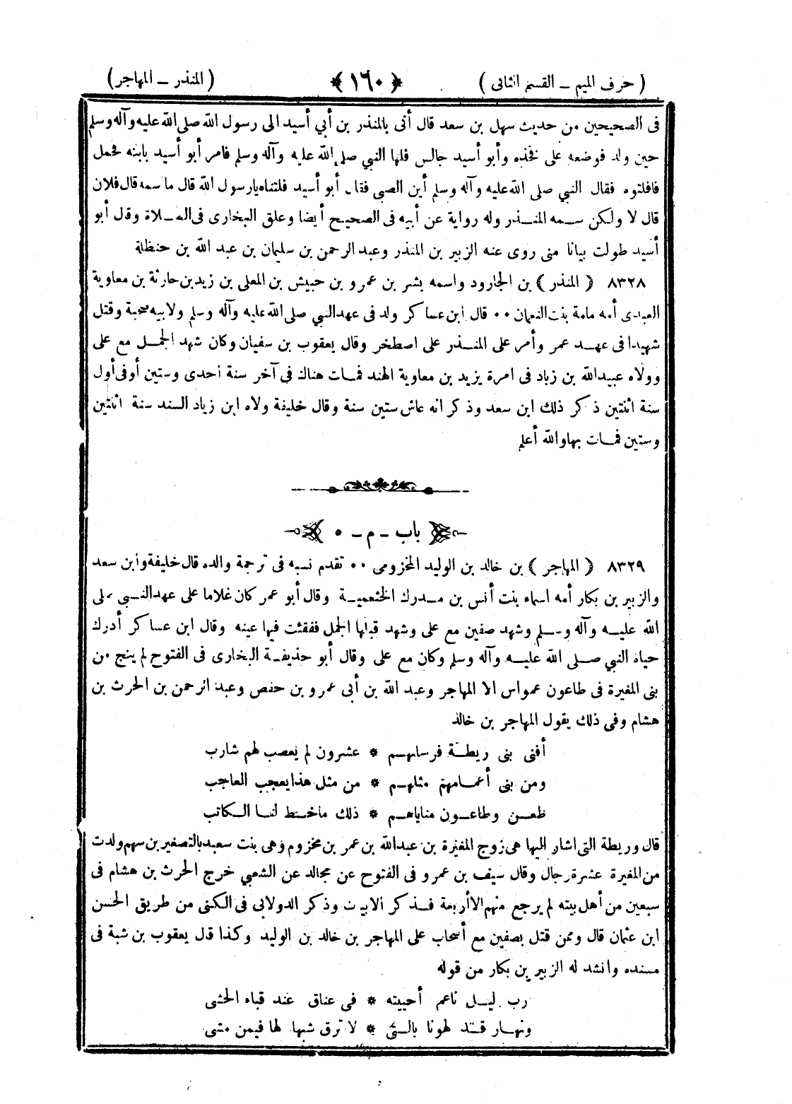 <160> في الصحيحين من حديث سهل بن سعد قال أتى المنذر بن أبي أسيد إلى رسول الله صلى الله عليه وسلم حين ولد فوضعه على فخذه وأبو أسيد جالس فلها النبي صلى الله عليه وسلم فأمر أبو أسيد بابنه فحمل فأقلبوه فقال النبي صلى الله عليه وسلم أين الصبي فقال أبو أسيد قلبناه يا رسول الله قال ما اسمه قال فلان قال لا ولكن سمه المنذر وله رواية عن أبيه في الصحيح أيضا وعلق البخاري في الصلاة وقال أبو أسيد طولت بنا يا بني روى عنه الزبير بن المنذر وعبد الرحمن بن سليمان بن عبد الله بن حنظلة المنذر بن الجارود واسمه بشر بن عمرو بن حبيش بن المعلى بن يزيد بن حارثة بن معاوية العبدي وأمه أمامة بنت النعمان قال بن عساكر ولد في عهد النبي صلى الله عليه وسلم ولأبيه صحبة وقتل شهيدا في عهد عمر وأمر علي المنذر على أصطخر وقال يعقوب بن سفيان وكان شهد الجمل مع علي وولاه عبيد الله بن زياد في إمرة يزيد بن معاوية الهند فمات هناك في آخر سنة إحدى وستين أو في أول سنة اثنتين ذكر ذلك بن سعد وذكر أنه عاش ستين سنة وقال خليفة ولاه بن زياد السند سنة اثنتين وستين فمات بها والله أعلم الميم بعدها الهاء المهاجر بن خالد بن الوليد المخزومي تقدم نسبه في ترجمة والده قال خليفة وابن سعد والزبير بن بكار أمه أسماء بنت أنس بن مدرك الخثعمية وقال أبو عمر كان غلاما على عهد النبي صلى الله عليه وسلم وشهد صفين مع علي وشهد قبلها الجمل ففقئت فيها عينه وقال بن عساكر أدرك حياة النبي صلى الله عليه وسلم وكان مع علي وقال أبو حذيفة البخاري في الفتوح لم ينج من بني المغيرة في طاعون عمواس إلا المهاجر وعبد الله بن أبي عمرو بن حفص وعبد الرحمن بن الحارث بن هشام وفي ذلك يقول المهاجر بن خالد أفنى بني ريطة فرسانهم عشرون لم يعصب لهم شارب ومن بني أعمامهم مثلهم من مثل هذا يعجب العاجب طعن وطاعون مناياهم ذلك ما خط لنا الكاتب قال وريطة التي أشار إليها هي زوج المغيرة بن عبد الله بن عمر بن مخروم وهي بنت سعيد بالتصغير بن سهم ولدت من المغيرة عشرة رجال وقال سيف بن عمر في الفتوح عن مجالد عن الشعبي خرج الحارث بن هشام في سبعين من أهل بيته لم يرجع منهم إلا أربعة فذكر الأبيات وذكر الدولابي في الكنى من طريق الحسن بن عثمان قال وممن قتل بصفين مع أصحاب علي المهاجر بن خالد بن الوليد وكذا قال يعقوب بن شيبة في مسنده وأنشد له الزبير بن بكار من قوله رب ليل ناعم أحييته في عفاف عند فنا الحشى ونهار قد لهونا بالتي لا ترى شبها لها فيمن مشى §