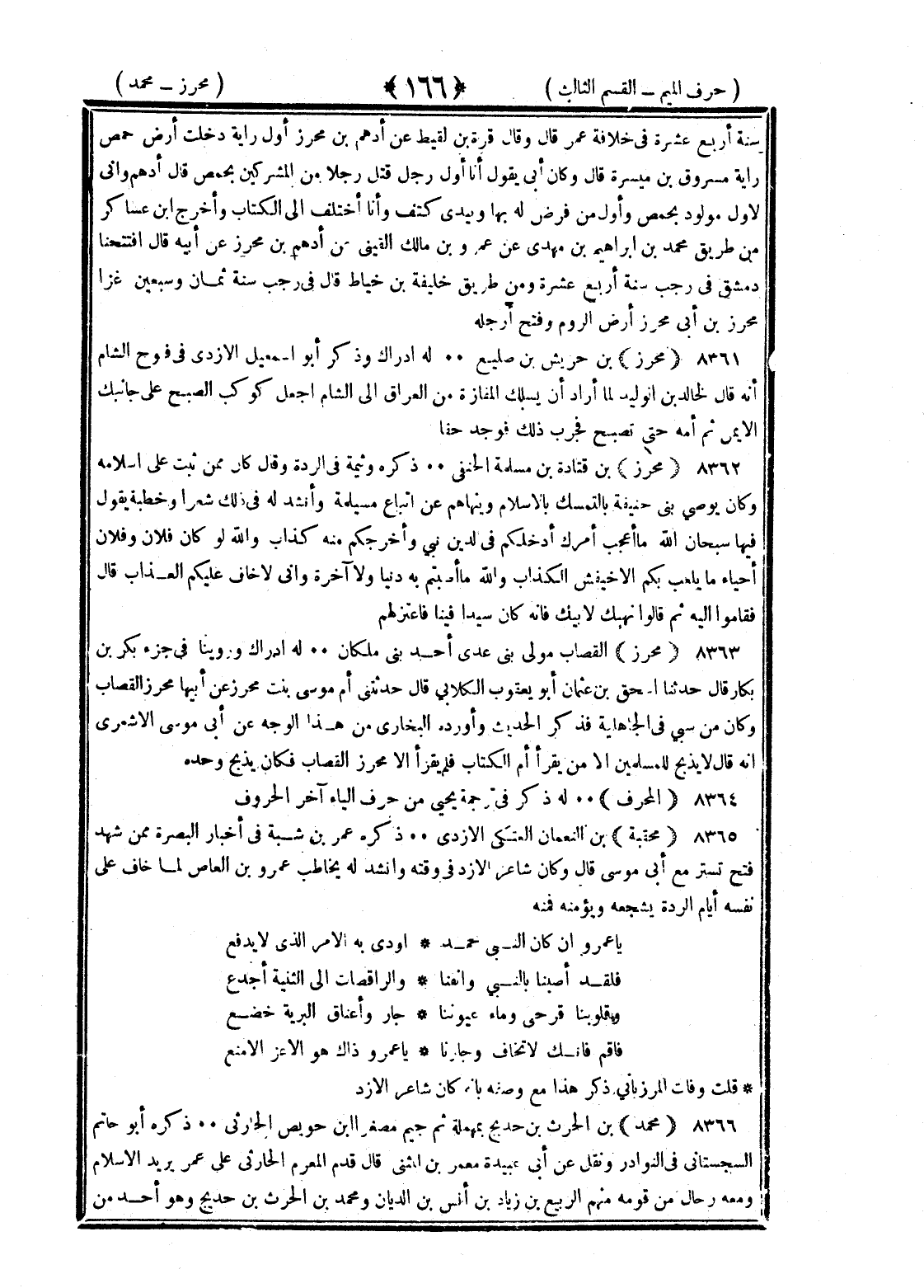 <166> سنة أربع عشرة في خلافة عمر قال وقال قرة بن لقيط عن أدهم بن محرز أول راية دخلت أرض حمص راية مسروق بن ميسرة قال وكان أبي يقول أنا أول رجل قتل رجلا من المشركين بحمص قال أدهم وإني لأول مولود بحمص وأول من فرض له بها وبيدي كتف وأنا أختلف إلى الكتاب وأخرج بن عساكر من طريق محمد بن إبراهيم بن مهدي عن عمرو بن مالك القيني عن أدهم بن محرز عن أبيه قال افتتحنا دمشق في رجب سنة أربع عشرة ومن طريق خليفة بن خياط قال في رجب سنة ثمان وسبعين غزا محرز بن أبي محرز أرض الروم وفتح أرحله محرز بن حريش بن صليع له إدراك وذكر أبو إسماعيل الأزدي في فتح الشام أنه قال لخالد بن الوليد لما أراد أن يسلك المفازة من العراق إلى الشام اجعل كوكب الصبح على جانبك الأيمن ثم أمه حتى تصبح فجرب ذلك فوجد حقا محرز بن قتادة بن مسلمة الحنفي ذكره وثيمة في الردة وقال كان ممن ثبت على إسلامه وكان يوصي بني حنيفة بالتمسك الإسلام وينهاهم عن اتباع مسليمة وأنشد له في ذلك شعرا وخطبة يقول فيها سبحان الله ما أعجب أمرك أدخلكم في الدين نبي واخرجكم منه كذاب والله لو كان فلان وفلان أحياء ما تلعب بكم الأخيفش الكذاب والله ما أصبتم به دنيا ولا آخرة وإني لأخاف عليكم العذاب قال فقاموا إليه ثم قالوا نهبك لأبيك فإنه كان سيدا فينا فاعتزلهم محرز بن القصاب مولى بني عدي أحد بني ملكان له إدراك وروينا في جزء بكر بن بكار قال حدثنا إسحاق بن عثمان أبو يعقوب الكلابي قال حدثتني أم موسى بنت محرز عن أبيه محرز القصاب وكان ممن سبي في الجاهلية فذكر الحديث وأورده البخاري من هذا الوجه عن أبي موسى الأشعري أنه قال لا يذبح للمسلمين إلا من يقرأ أم الكتاب فلم يقرأ إلا محرز القصاب فكان يذبح وحده المحرق له ذكر في ترجمة يحيى بن حرف الياء آخر الحروف محقبة بن النعمان العتكي الأزدي ذكره عمر بن شبة في أخبار البصرة فيمن شهد فتح تستر مع أبي موسى قال وكان شاعر الأزد في وقته وأنشد يخاطب عمرو بن العاص لما خاف على نفسه أيام الردة يشجعه ويؤمنه فمنه يا عمرو إن كان النبي محمد أودي به الأمر الذي لا يدفع فلقد أصبنا بالنبي وأنفنا والراقصات إلى الثنية أجدع وقلوبنا قرحى وماء عيوننا جار وأعناق البرية خضع فأقم فإنك لا تخاف وجارنا يا عمرو ذاك هو الأعز الأمنع قلت وفات المرزباني ذكر هذا مع وصفه بأنه كان شاعر الأزد محمد بن الحارث بن حديج بمهملة ثم جيم مصغرا بن حويص الحارثي ذكره أبو حاتم السجستاني في النوادر ونقل عن أبي عبيدة معمر بن المثنى قال قدم المعرم الحارثي على عمر يريد الإسلام ومعه رجال من قومه منهم الربيع بن زياد بن أنس بن الديان ومحمد بن الحارث بن حديج وهو أحد من §