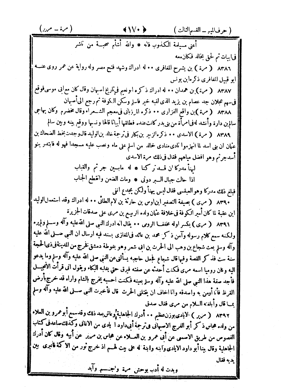 <170> أعني مسيلمة الكذوب فإنه والله أشأم صحبة من قاشر في أبيات ثم لحق بخالد فكان معه مرة بن ليشرح المعافري له إدراك وشهد فتح مصر وله رواية عن عمر روى عنه أبو قبيل المعافري ذكره بن يونس مرة بن همدان له إدراك ذكره أبو نعيم في تاريخ أصبهان وقال كان مع أبي موسى فوقع في سهم عجلان جد عصام بن يزيد الذي لقبه خير فأسلم وسكن الكوفة ثم رجع إلى أصبهان مرة بن واقع الفزاري ذكره المرزباني في معجم الشعراء وقال مخضرم وكان يهاجي سالم بن دارة وأنشد له في امرأة من بني بدر كانت عنده فطلقها أبياتا قالها وبسببها وقع بينه وبين سالم مرة الأسدي ذكره الزبير بن بكار في ترجمة خالد بن الوليد قال وجدت بخط الضحاك بن عثمان أن بني أسد لما انهزموا نادى منادي خالد من أسلم على ماء ونصب عليه مسجدا فهو له فابتدر بنو أسد جرثم وهو أفضل مياههم فقال في ذلك مرة الأسدي ليهنىء مدركا أن قد تركنا له ما بين جرثم والقباب إذا حالت جبال البشر دوني ومات الضغن وانقطع الجناب فبلغ ذلك مدركا وهو العنقسي فقال ليس يهنيني ولكن يجدع أنفي مري بصيغة التصغير بن أوس بن حارثة بن لام الطائي له إدراك وقد استعمل الوليد بن عقبة لما كان أمير الكوفة في خلافة عثمان ولده الربيع بن مري على صدقات الجزيرة مري بكسر أوله مخففا الرومي يقال إنه أدرك النبي صلى الله عليه وسلم ولم يره ولكنه سمع كلام رسوله وآمن ذكر محمد بن عائذ في المغازي بسند فيه إرسال أن النبي صلى الله عليه وسلم بعث شجاع بن وهب إلى الحارث بن أبي شمر وهو بغوطة دمشق فخرج من المدينة في ذي الحجة سنت ست فذكر القصة وفيها قال شجاع فجعل حاجبه يسألني عن النبي صلى الله عليه وسلم وما يدعو إليه وكان روميا اسمه مري فكنت أحدثه عن صفته فيرق حتى يغلبه البكاء ويقول إني قرأت الإنجيل فأجد صفة هذا الني صلى الله عليه وسلم بعينه فكنت أحسبه يخرج بالشام واراه قد خرج بأرض القرظ فأنا أومن به وأصدقه وأنا أخاف أن يقتلني الحارث قال فأخبرت النبي صلى الله عليه وسلم بما قال وأبلغته السلام مري فقال صدق مرير الإيادي بوزن عظيم أدرك الجاهلية وعاش بعد ذلك وقد سمع أبو عمرو بن العلاء من ولده هجاس ذكر أبو الفرج الأصبهاني في ترجمة أبي داود الإيادي من الأغاني وكذلك صاعد في كتاب القصوص من طريق الأصمعي عن أبي عمرو بن العلاء عن هجاس بن مرير عن أبيه قال كان أدرك الجاهلية وقال بينا أبو داود الإيادي وابنه وابنة له على بيت لهم إذ خرج ثور من الأكمة فانبرى بين يده فقال وبدت له أذن توجس حرة وأحم وائد §