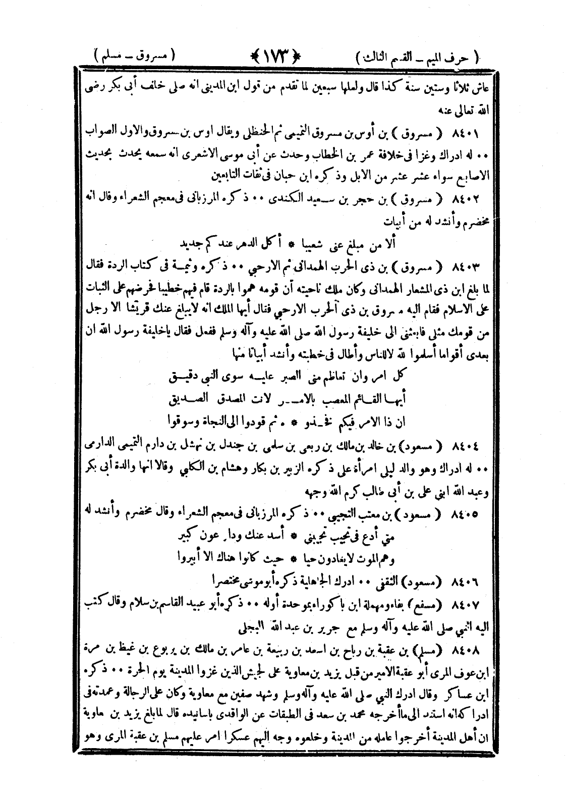 <173> عاش ثلاثا وستين سنة كذا قال ولعلها سبعين لما تقدم من قول بن المديني أنه صلى خلف أبي بكر رضي الله عنه مسروق بن أوس بن مسروق التميمي ثم الحنظلي ويقال أوس بن مسروق والأول الصواب له إدراك وغزا في خلافة عمر بن الخطاب وحدث عن أبي موسى الأشعري أنه سمعه يحدث بحديث الأصابع سواء عشر عشر من الإبل وذكره بن حبان في ثقات التابعين مسروق بن حجر بن سعيد الكندي ذكره المرزباني في معجم الشعراء وقال إنه مخضرم وأنشد له من أبيات ألا من مبلغ عني شعيبا أكل الدهر عزكم جديد مسروق بن ذي الحارث الهمداني ثم الأرحبي ذكره وثيمة في كتاب الردة فقال لما بلغ بن ذي المشعار الهمداني وكان ملك ناحيته أن قومه لما هموا بالردة قام فيهم خطيبا فحرضهم على الثبات على الإسلام فقام إليه مسروق بن ذي الحارث الأرحبي فقال أيها الملك إنه لا يبلغ عنك قريشا إلا رجل من قومك مثلي فابعثني إلى خليفة رسول الله صلى الله عليه وسلم ففعل فقال يا خليفة رسول الله إن بعدي أقواما أسلموا لله لا للناس وأطال في خطبته وأنشد أبياتا منها كل أمر وإن تعاظم مني الصبر عليه سوى النبي رقيق أيها القائم المعصب بالأمر لأنت المصدق الصديق إن ذا الأمر فيكم فخذوه ثم قودوا إلى النجاة وسوقوا مسعود بن خالد بن مالك بن ربعي بن سلمي بن جندل بن نهشل بن دارم التميمي الدارمي له إدراك وهو والد ليلى امرأة علي ذكره الزبير بن بكار وهشام بن الكلبي وقالا إنها والدة أبي بكر وعبد الله ابني علي بن أبي طالب كرم الله وجهه مسعود بن معتب التجيبي ذكره المرزباني في معجم الشعراء وقال مخضرم وأنشد له ومتى أدع في تجيب تجبني أسد غيل ودار عون كثير وهم الموت لا يغازون حيا حيث كانوا هناك إلا أبيروا مسعود الثقفي أدرك الجاهلية ذكره أبو موسى مختصرا مسفع بفاء مهملة بن باكورا بموحدة أوله ذكره أبو عبيد القاسم بن سلام وقال كتب إليه النبي صلى الله عليه وسلم مع جرير بن عبد الله البجلي مسلم بن عقبة بن رباح بن أسعد بن ربيعة بن عامر بن مالك بن يربوع بن غيظ بن مرة بن عوف المري أبو عقبة الأمير من قبل يزيد بن معاوية على الجيش الذين غزوا المدينة يوم الحرة ذكره بن عساكر وقال أدرك النبي صلى الله عليه وسلم وشهد صفين مع معاوية وكان على الرجالة وعمدته في إدراكه أنه استند إلى ما أخرجه محمد بن سعد في الطبقات عن الواقدي بأسانيده قال لما بلغ يزيد بن معاوية أن أهل المدينة أخرجوا عامله من المدينة وخلعوه وجه إليهم عسكرا أمر عليهم مسلم بن عقبة المري وهو §