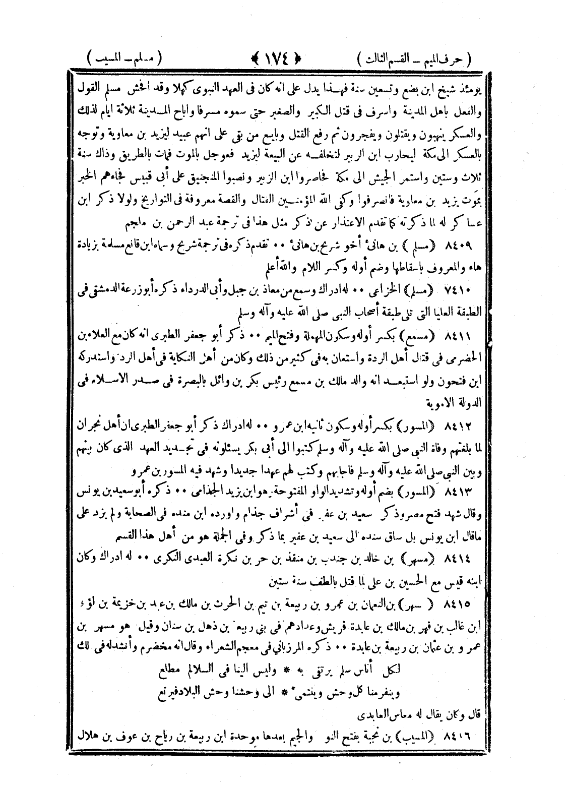 <174> يومئذ شيخ بن بضع وتسعين سنة فهذا يدل على أنه كان في العهد النبوي كهلا وقد أفحش مسلم القول والفعل بأهل المدينة وأسرف في قتل الكبير والصغير حتى سموه مسرفا وأباح المدينة ثلاثة أيام لذلك والعسكر ينهبون ويقتلون ويفجرون ثم رفع القتل وبايع من بقي على أنهم عبيد ليزيد بن معاوية وتوجه بالعسكر إلى مكة ليحارب بن الزبير لتخلفه عن البيعة ليزيد فعوجل بالموت فمات بالطريق وذاك سنة ثلاث وستين واستمر الجيش إلى مكة فحاصروا بن الزبير ونصبوا المنجنيق على أبي قبيس فجاءهم الخبر بموت يزيد بن معاوية وانصرفوا وكفى الله المؤمنين القتال والقصة معروفة في التواريخ ولولا ذكر بن عساكر لما ذكرته كما تقدم في الاعتذار عن ذكر مثل هذا في ترجمة عبد الرحمن بن ملجم مسلم بن هانئ أخو شريح بن هانئ تقدم ذكره في ترجمة شريح وسماه بن قانع مسلمة بزيادة هاء والمعروف باسقاطها وضم أوله وكسر اللام والله أعلم مسلم الخزاعي له إدراك وسمع من معاذ بن جبل وأبي الدرداء ذكره أبو زرعة الدمشقي في الطبقة العليا التي تلي طبقة أصحاب النبي صلى الله عليه وسلم مسمع بكسر أوله وسكون المهملة وفتح الميم ذكر أبو جعفر الطبري أنه كان مع العلاء بن الحضرمي في قتال الردة واستعان به في كثير من ذلك وكان من أهل النكاية في أهل الردة واستدركه بن فتحون ولم أستبعد أنه والد مالك بن مسمع رئيس بكر بن وائل بالبصرة في صدر الإسلام في الدولة الأموية المسور بكسر أوله وسكون ثانيه بن عمرو له إدراك ذكر أبو جعفر الطبري أن أهل نجران لما بلغهم وفاة النبي صلى الله عليه وسلم كتبوا إلى أبي بكر يسألونه في تجديد العهد الذي كان بينهم وبين النبي صلى الله عليه وسلم فأجابهم وكتب لهم عهدا جديدا وشهد فيه المسور بن عمرو المسور بضم أوله وتشديد الواو المفتوحة وهو بن يزيد الجذامي ذكره أبو سعيد بن يونس وقال شهد فتح مصر وذكره سعيد بن عفير في أشراف جذام وأورده بن منده في الصحابة ولم يزد على ما قال بن يونس بل ساق سنده إلى سعيد بن عفير بما ذكره وفي الجملة هو من أهل هذا القسم مسهر بن خالد بن جندب بن منقذ بن حر بن نكرة العبدي النكري له إدراك وكان ابنه قيس مع الحسين بن علي لما قتل بالطف سنة ستين مسهر بن النعمان بن عمرو بن ربيعة بن تيم بن الحارث بن مالك بن عبيد بن جزيمة بن لؤي بن غالب بن فهر بن مالك بن عائذة قريش وعدادهم في بني ربيعة بن ذهل بن شيبان وقيل هو مسهر بن عمرو بن عثمان بن ربيعة بن عائذة ذكره المرزباني في معجم الشعراء وقال إنه مخضرم وأنشد له في ذلك لكل أناس سلم يرتقى به وليس إلينا في السلالم مطلع وينفر منا كل وحش وينتمي إلى وحشنا وحش البلاد فيرتع قال وكان يقال له مقاس العائذي المسيب بن نجبة بفتح النون والجيم بعدها موحدة بن ربيعة بن رباح بن عوف بن هلال §