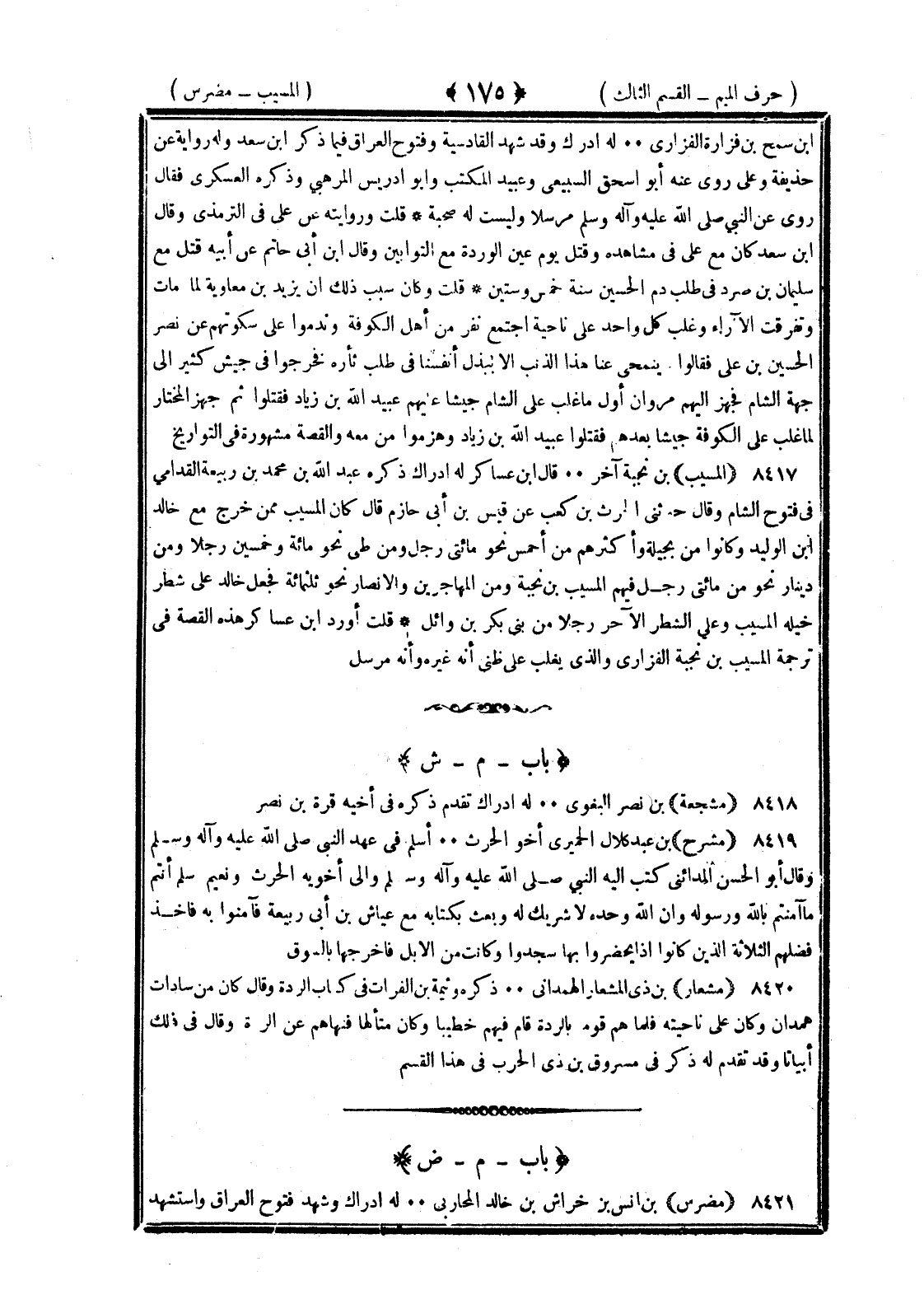 <175> بن شمخ بن فرارة الفزاري له إدراك وقد شهد القادسية وفتوح العراق فيما ذكر بن سعد وله رواية عن حذيفة وعلي روى عنه أبو إسحاق السبيعي وعبيد المكتب وأبو إدريس المرهبي وذكره العسكري فقال روى عن النبي صلى الله عليه وسلم مرسلا وليست له صحبة قلت وروايته عن علي في الترمذي وقال بن سعد كان مع علي في مشاهده وقتل يوم عين الوردة مع النواس وقال بن أبي حاتم عن أبيه قتل مع سليمان بن صرد في طلب دم الحسين سنة خمس وستين قلت وكان سبب ذلك أن يزيد بن معاوية لما مات وتفرقت الآراء وغلب كل واحد على ناحية اجتمع نفر من أهل الكوفة وندموا على سكوتهم عن نصر الحسين بن علي فقالوا ما ينمحي عنا هذا الذنب إلا ببذل أنفسنا في طلب ثأره فخرجوا في جيش كثير إلى جهة الشام فجهز إليهم مروان أول ما غلب على الشام جيشا عليهم عبيد الله بن زياد فقتلوا ثم جهز المختار لما غلب على الكوفة جيشا بعدهم فقتلوا عبيد الله بن زياد وهزموا من معه والقصة مشهورة في التواريخ المسيب بن نجبة آخر قال بن عساكر له إدراك ذكره عبد الله بن محمد بن ربيعة القدامى في فتوح الشام وقال حدثني الحارث بن كعب عن قيس بن أبي حازم قال كان المسيب ممن خرج مع خالد بن الويد وكانوا مع بجيلة وأكثرهم من أحمس نحو مائتي رجل ومن طي نحو مائة وخمسين رجلا ومن ذيبان نحو مائتي رجل فيهم المسيب بن نجبة ومن المهاجرين والأنصار نحو ثلاثمائة فجعل خالد على شطر خيله المسيب وعلى الشطر الآخر رجلا من بني بكر بن وائل قلت أورد بن عساكر هذه القصة في ترجمة المسيب بن نجبة الفزاري والذي يغلب على ظني أنه غيره وأنه أرسل الميم بعدها الشين مشجعة بن نضر البغوي له إدراك تقدم ذكره في أخيه قرة بن نضر مشرح بن عبد كلال الجميري أخو الحارث أسلم في عهد النبي صلى الله عليه وسلم وقال أبو الحسن المدائني كتب إليه النبي صلى الله عليه وسلم وإلى أخويه الحارث ونعيم سلم أنتم ما آمنتم بالله ورسوله وأن الله وحده لا شريك له وبعث بكتابه مع عياش بن أبي ربيعة فآمنوا به فأخذ فضلهم الثلاثة الذين كانوا إذا يحضرونها سجدوا وكانت من الإبل فأخرجها بالسوق مشعار بن ذي المشعار الهمداني ذكره وثيمة بن الفرات في كتاب الردة وقال كان من سادات همدان وكان على ناحيته فلما هم قومه بالردة قام فيهم خطيبا وكان متألها فنهاهم عن الردة وقال في ذلك أبياتا وقد تقدم له ذكر في مسروق بن ذي الحارث في هذا القسم الميم بعدها الضاد مضرس بن أنس بن خراش بن خالد المحاربي له إدراك وشهد فتوح العراق واستشهد §