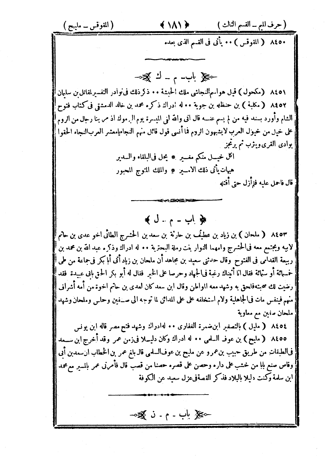 <181> المقوقس يأتي في القسم الذي بعده مكحول قيل هو اسم النجاشي ملك الحبشة ذكر ذلك في نوادر التفسير لمقاتل بن سليمان مكلبة بن حنظلة بن جوية له إدراك ذكره محمد بن خالد الدمشقي في كتاب فتوح الشام وأورد بسند فيه من لم يسم عنه قال إني والله لفى الميسرة يوم اليرموك إذ مر بنا رجال من الروم على خيل من خيول العرب لا يشبهون الروم فما أنسى قول قائل منهم النجاء الحقوا بوادي القرى ويثرب ثم يرتجز أكل حين منكم مغير يحل في البلقاء والسدير هيهات يأتي ذلك الأمير والملك المتوج المحبور قال فأحمل عليه فلم أزل حتى أقتله الميم بعدها اللام ملحان بن زنار بن غطيف بن حارثة بن سعيد بن حشرج الطائي أخو عدي بن حاتم لأبيه ويجتمع معه في الحشرج وأمهما النوار بنت رملة البحترية له إدراك وذكره عبد الله بن محمد بن ربيعة القدامى في الفتوح وقال حدثني سعيد بن مجاهد أن ملحان بن زنار أتى أبا بكر في جماعة من طي خمسمائة أو ستمائة فقال إنا أتيناك رغبة في الجهاد وحرصا على الخير فقال له أبو بكر الحق بأبي عبيدة فقد رضيت لك صحبته فلحق به وشهد معه المواطن وقال بن سعيد كان لعدي بن حاتم إخوة من أمه أشراف منهم قبيعس مات في الجاهلية ولأم استخلفه على علي المدائن لما توجه إلى صفين وحليس وملحان وشهد ملحان صفين مع معاوية مليل بالتصغير بن ضمرة الغفاري له إدراك وشهد فتح مصر قاله بن يونس مليح بن عوف السلمي له إدراك وكان دليلا في زمن عمر وقد أخرج بن سعد في الطبقات من طريق حبيب بن عمرو عن مليح بن عوف السلمي قال بلغ عمر بن الخطاب أن سعد بن أبي وقاص صنع بابا من خشب على داره وحصن على قصره حصنا من قصب قال فأمرني عمر بالمسير مع محمد بن مسلمة وكنت دليلا بالبلاد فذكر القصة في عزل سعد عن الكوفة الميم بعدها النون §