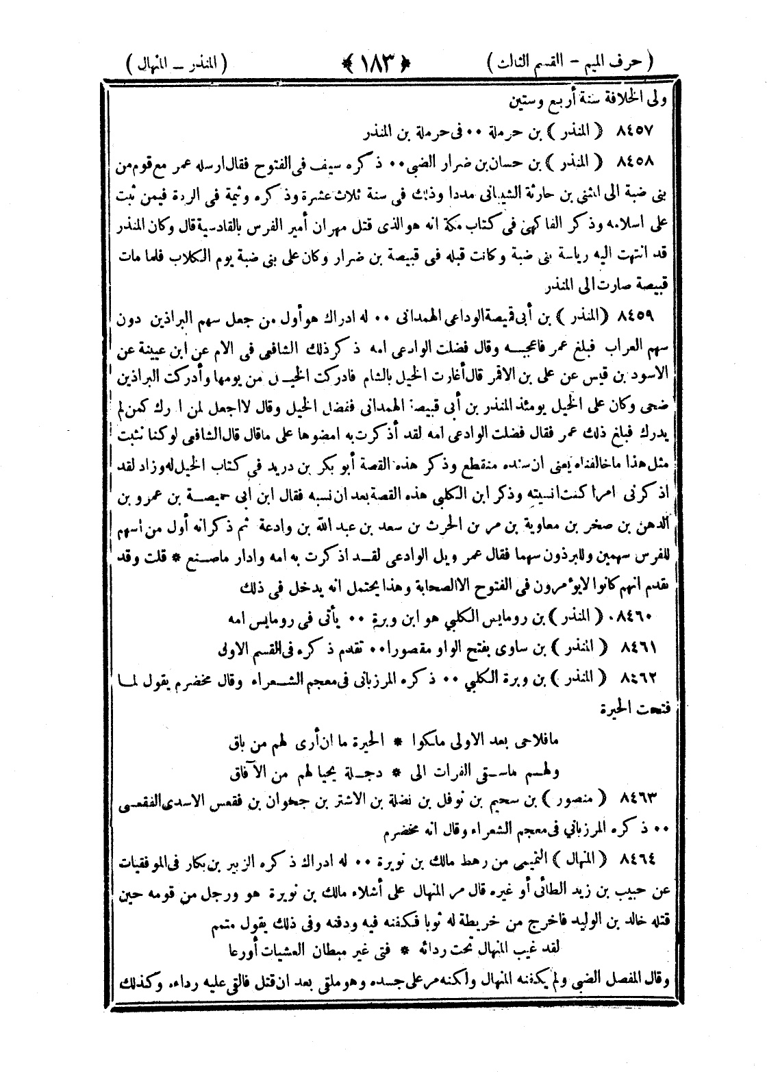 <183> ولي الخلافة سنة أربع وستين المنذر بن حرملة في حرملة بن المنذر المنذر بن حسان بن ضرار الضبي ذكره سيف في الفتوح فقال أرسله عمر مع قوم من بني ضبة إلى المثنى بن حارثة الشيباني مددا وذلك في سنة ثلاث عشرة وذكره وثيمة في الردة فيمن ثبت على إسلامه وذكر الفاكهي في كتاب مكة أنه هو الذي قتل مهران أمير الفرس بالقادسية قال وكان المنذر قد انتهت إليه رياسة بني ضبة وكانت قبله في قبيصة بن ضرار وكان على بني ضبة يوم الكلاب فلما مات قبيصة صارت إلى المنذر المنذر بن أبي حميضة الوداعي الهمداني له إدراك هو أول من جعل سهم البراذين دون سهم العراب فبلغ عمر فأعجبه وقال فضلت الوداعي أمه ذكر ذلك الشافعي في الأم عن بن عيينة عن الأسود بن قيس عن علي بن الأرقم قال أغارت الخيل بالشام فأدركت الخيل من يومها وأدركت البراذين ضحى وكان على الخيل يومئذ المنذر بن أبي قبيصة الهمداني ففضل الخيل وقال لا أجعل من أدرك كمن لم يدرك فبلغ ذلك عمر فقال فضلت الوداعي أمه لقد أذكرت به امضوها على ما قال قال الشافعي لو كنا نثبت مثل هذا ما خالفناه يعني أن سنده منقطع وذكر هذه القصة أبو بكر بن دريد في كتاب الخيل له وزاد لقد أذكرني أمرا كنت أنسيته وذكر بن الكبي هذه القصة بعد أن نسبه فقال بن أبي حميضة بن عمرو بن الدهن بن صخر بن معاوية بن مر بن الحارث بن سعد بن عبد الله بن وداعة ثم ذكر أنه أول من أسهم للفرس سهمين وللبرذون سهما فقال عمر ويل الوداعي لقد أذكرت به أمه وأدار ما صنع قلت وقد تقدم أنهم كانوا لا يؤمرون في الفتوح إلا الصحابة وهذا يحتمل أن يدخل في ذلك المنذر بن رومانس الكلبي هو بن وبرة يأتي في رومانس أمه المنذر بن ساري بفتح الواو مقصورا تقدم ذكره في القسم الأول المنذر بن وبرة الكلبي ذكره المرزباني في معجم الشعراء وقال مخضرم يقول لما فتحت الحيرة ما فلاحي بعد الألى ملكوا الحيرة ما إن أرى لهم من باق ولهم ما سقى الفرات إلى دجلة يحيا لهم من الآفاق منصور بن سحيم بن نوفل بن نضلة بن الأشتر بن جحوان بن فقعس الأسدي الفقعسي ذكره المرزباني في معجم الشعراء وقال إنه مخضرم المنهال التميمي من رهط مالك بن نويرة له إدراك ذكره الزبير بن بكار في الموفقيات عن حبيب بن زيد الطائي أو غيره قال مر المنهال على أشلاء مالك بن نويرة هو ورجل من قومه حين قتله خالد بن الوليد فأخرج من خريطة له ثوبا فكفنه فيه ودفنه وفي ذلك يقول متمم لقد غيب المنهال تحت ردائه فتى غير مبطان العشيات أروعا وقال المفضل الضبي لم يكفنه المنهال ولكنه مر على جسده وهو ملقى بعد أن قتل فألقى عليه رداءه وكذلك §