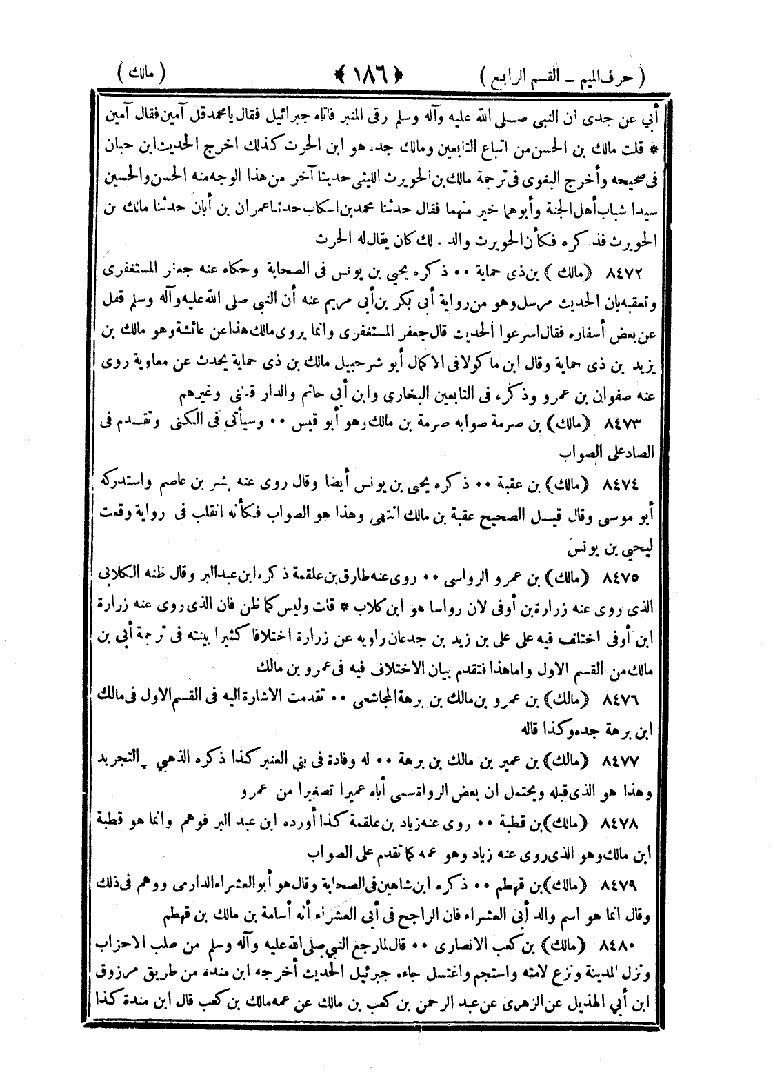 <186> أبي عن جدي أن النبي صلى الله عليه وسلم رقى المنبر فأتاه جبرائيل فقال يا محمد قل آمين فقال آمين قلت مالك بن الحسن من أتباع التابعين ومالك جده هو بن الحارث كذلك أخرج الحديث بن حبان في صحيحه وأخرج البغوي في ترجمة مالك بن الحويرث الليثي حديثا آخر من هذا الوجه متنه الحسن والحسين سيدا شباب أهل الجنة وأبوهما خير منهما فقال حدثنا محمد بن أشكاب حدثنا عمران بن أبان حدثنا مالك بن الحويرث فذكره فكأن الحويرث والد مالك كان يقال له الحارث مالك بن ذي حماية ذكره يحيى بن يونس في الصحابة وحكاه عنه جعفر المستغفري وتعقبه بأن الحديث مرسل وهو رواية أبي بكر بن أبي مريم عنه أن النبي صلى الله عليه وسلم قفل من بعض أسفاره فقال أسرعوا الحديث قال جعفر المستغفري وإنما يروي مالك هذا عن عائشة وهو مالك بن يزيد بن ذي حماية وقال بن ماكولا في الإكمال أبو شرحبيل مالك بن ذي حماية يحدث عن معاوية روى عنه صفوان بن عمرو وذكره في التابعين البخاري وابن أبي حاتم والدارقطني وغيرهم مالك بن صرمة صوابه صرمة بن مالك وهو أبو قيس وسيأتي في الكنى وتقدم في الصاد على الصواب مالك بن عقبة ذكره يحيى بن يونس أيضا وقال روى عنه بشر بن عاصم واستدركه أبو موسى وقال قيل الصحيح عقبة بن مالك انتهى وهذا هو الصواب فكأنه انقلب في رواية وقعت ليحيى بن يونس مالك بن عمرو الرؤاسي روى عنه طارق بن علقمة ذكره بن عبد البر وقال أظنه الكلابي الذي روى عنه زرارة بن أوفى لأن رؤاسا هو بن كلاب قلت وليس كما ظن فإن الذي روى عنه زرارة بن أوفى اختلف فيه على علي بن زيد بن جدعان راويه عن زرارة اختلافا كثيرا بينته في ترجمة أبي بن مالك من القسم الأول وأما هذا فتقدم بيان الاختلاف فيه في عمرو بن مالك مالك بن عمرو بن مالك بن برهة المجاشعي تقدمت الإشارة إليه في القسم الأول في مالك بن برهة جده وكذا قاله مالك بن عمير بن مالك بن برهة له وفادة في بني العنبر وكذا ذكره الذهبي في التجريد وهذا هو الذي قبله ويحتمل أن بعض الرواة سمى أباه عميرا تصغيرا من عمرو مالك بن قهطم روى عنه زياد بن علاقة كذا أورده بن عبد البر فوهم وإنما هو قطبة بن مالك وهو الذي روى عنه زياد وهو عمه كما تقدم على الصواب مالك بن قهطم ذكره بن شاهين في الصحابة وقال هو أبو العشراء الدارمي ووهم في ذلك وإنما هو اسم والد أبي العشراء فإن الراجح اسم أبي العشراء أنه أسامة بن مالك بن قهطم مالك بن كعب الأنصاري قال لما رجع النبي صلى الله عليه وسلم من طلب الأحزاب ونزل المدينة ونزع لامته واستجمر واغتسل جاءه جبريل الحديث أخرجه بن منده من طريق مرزوق بن أبي الهذيل عن الزهري عن عبد الرحمن بن كعب بن مالك عن عمه مالك بن كعب قال بن منده كذا §