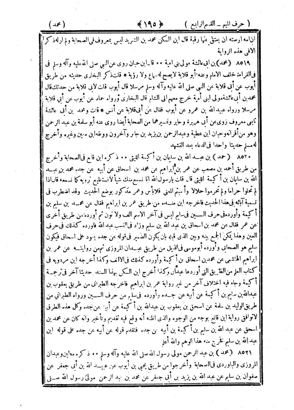 <195> أن أمه أوصته أن يعتق عنها رقبة قال بن السكن محمد بن الشريد ليس بمعروف في الصحابة ولم أر له ذكرا إلا في هذه الرواية محمد بن أبي عائشة مولى بني أمية قال بن حبان روى عن النبي صلى الله عليه وسلم في القراءة خلف الإمام وعنه أبو قلابة لا يصح له سماع ولا رؤية قلت ذكر البخاري حديثه من طريق أيوب عن أبي قلابة عن النبي صلى الله عليه وسلم مرسلا قال أيوب قلت لأبي قلابة من حدثك قال محمد بن أبي عائشة مولى لبني أمية خرج معهم إلى الشام قال البخاري ورواه حماد عن أيوب عن أبي قلابة مرسلا ورواه عبيد الله بن عمرو عن أيوب فقال عن أبي قلابة عن أنس قلت ومحمد بن أبي عائشة تابعي معروف روى عن أبي هريرة وجابر وغيرهما من الصحابة أيضا روى عنه أبو سلمة بن عبد الرحمن وهو من أقرانه وحبان بن عطية وعبد الرحمن بن يزيد بن جابر وآخرون ووثقه بن معين وغيره وأخرج له مسلم حديثا واحدا في الدعاء بعد التشهد محمد بن عبد الله بن سليمان بن أكيمة الليثي ذكره بن قانع في الصحابة وأخرج من طريق أحمد بن مصعب عن عمر بن إبراهيم عن محمد بن إسحاق عن أبيه عن جده محمد بن عبد الله بن سليمان بن أكيمة الليثي قال قلت يا رسول الله إنا نسمع منك شيئا لا نستطيع نرويه كما نسمعه قال إذا لم تحلوا حراما ولم تحرموا حلالا وأصبتم المعنى فلا بأس وعمر مذكور بوضع الحديث وقد اضطرب في تسمية آبائه في هذا الحديث فأخرجه بن منده من طريق عمر بن إبراهيم فقال عن محمد بن سليم بن أكيمة وأورده في حرف السين في سليم ليس في آخر الاسم ألف ولا نون ثم أورده من طريق أخرى عن عمر فقال عن محمد بن إسحاق بن عبد الله بن سليم وزاد في النسب عبد الله فأورده كذلك في حرف العين وهذا يمكن الجمع بينه وبين الذي قبله بأن يكون الضمير في قوله عن جده يعود على إسحاق فيكون سليم هو الصحابي وأورده أبو موسى في الذيل من طريق عبدان المروزي ثم من روايته عن عمر بن إبراهيم الهاشمي عن محمد بن إسحاق بن أكيمة وأورده كذلك في الألف وكذا أخرجه بن مردويه في كتاب العلم من الطريق التي أوردها عبدان وكذا أخرج بن السكن بهذا السند حديثا آخر في ترجمة أكيمة وجاء فيه اختلاف آخر من غير رواية عمر بن إبراهيم فأخرجه الطبراني من طريق يعقوب بن عبد الله بن سليم بن أكيمة عن أبيه عن جده أورده في سليم من حرف السين ورواه الطبراني من طريق الوليد بن سلمة عن إسحاق بن يعقوب بن عبد الله بن أكيمة عن أبيه عن جده وكل هذه الطرق لا توافق رواية بن قانع بوجه من الوجوه والذي أظنه أنه وقع فيه تقديم وتأخير وأنه كان عن محمد بن إسحاق عن عبد الله بن سليم بن أكيمة عن أبيه عن جده فتقدم قوله عن أبيه عن جده على قوله بن عبد الله بن سليم فخرج منه هذا الوهم والله أعلم محمد بن عبد الرحمن مولى رسول الله صلى الله عليه وسلم ذكره مطين وعبدان المرزوي والباوردي في الصحابة وأخرجوا من طريق يحيى بن أيوب عن عبيد الله بن أبي جعفر عن صفوان بن سليم عن عبد الله بن يزيد بن أبي جعفر عن محمد بن عبد الرحمن مولى §