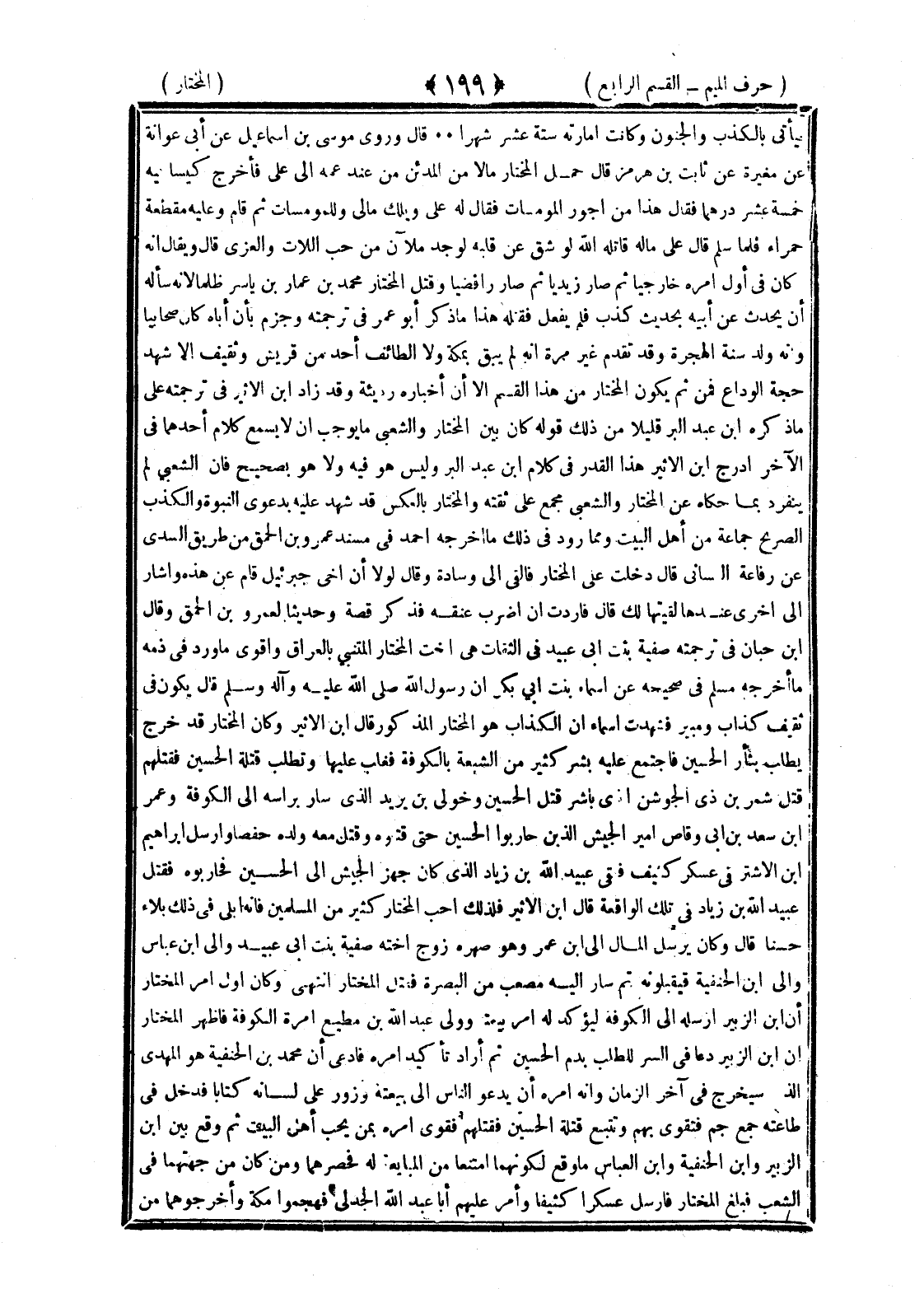 <199> فيأتي بالكذب والجنون وكانت إمارته ستة عشر شهرا قال وروى موسى بن إسماعيل عن أبي عوانة عن مغيرة عن ثابت بن هرمز قال حمل المختار مالا من المدائن من عند عمه إلى علي فأخرج كيسا فيه خمسة عشر درهما فقال هذا من أجور المومسات فقال له علي ويلك مالي وللمومسات ثم قام وعليه مقطعة حمراء فلما سلم قال علي ما له قاتله الله لو شق عن قلبه الآن لوجد ملآن من حب اللات والعزى قال ويقال إنه كان في أول أمره خارجيا ثم صار زيديا ثم صار رافضيا وقتل المختار محمد بن عمار بن ياسر ظلما لأنه سأله أن يحدث عن أبيه بحديث كذب فلم يفعل فقتله وهذا ما ذكره أبو عمر في ترجمته وجزم بأن أباه كان صحابيا وأنه ولد سنة الهجرة وقد تقدم غير مرة أنه لم يبق بمكة ولا الطائف أحد من قريش وثقيف إلا شهد حجة الوداع فمن ثم يكون المختار من هذا القسم إا أن أخباره رديئة وقد زاد بن الأثير في ترجمته على ما ذكره بن عبد البر قليلا من ذلك قوله كان بين المختار والشعبي ما يوجب ألا يسمع كلام أحدهما في الآخر أدرج بن الأثير هذا القدر في كلام بن عبد البر وليس هو فيه ولا هو بصحيح فإن الشعبي لم ينفرد بما حكاه عن المختار والشعبي مجمع على ثقته والمختار بالعكس قد شهد عليه بدعوى النبوة والكذب الصريح جماعة من أهل البيت ومما ورد في ذلك ما أخرجه أحمد في مسند عمرو بن الحمق من طريق السدي عن رفاعة القتباني قال دخلت على المختار فألقلى إلي وسادة وقال لولا أن أخي جبرائيل قام عن هذه وأشار إلى أخرى عنده لألقيتها لك قال فأردت أن أضرب عنقه فذكر قصة وحديثا لعمرو بن الحمق وقال بن حبان في ترجمته صفية بنت أبي عبيد في الثقات هي أخت المختار المتنبي بالعراق وأقوى ما ورد في ذمه ما أخرجه مسلم في صحيحه عن أسماء بنت أبي بكر أن رسول الله صلى الله عليه وسلم قال يكون في ثقيف كذاب ومبير فشهدت أسماء أن الكذاب هو المختار المذكور قال بن الأثير وكان المختار قد خرج يطلب بثأر الحسين فاجتمع عليه بشر كثير من الشيعة بالكوفة فغلب عليها وتطلب قتلة الحسين فقتلهم قتل شمر بن ذي الجوشن الذي باشر قتل الحسين وخولي بن يزيد الذي سار برأسه إلى الكوفة وعمر بن سعد بن أبي وقاص أمير الجيش الذي حاربوا الحسين حتى قتلوه وقتل معه ولده حفصا وأرسل إبراهيم بن الأشتر في عسكر كثيف فلقي عبيد الله بن زياد الذي كان جهز الجيش إلى الحسين فحاربوه فقتل عبيد الله بن زياد في تلك الواقعة قال بن الأثير فلذلك أحب المختار كثير من المسلمين فإنه أبلى في ذلك بلاء حسنا قال وكان يرسل المال إلى بن عمر وهو صهره زوج أخته صفية بنت أبي عبيد وإلى بن عباس وإلى بن الحنفية فيقبلونه ثم سار إيه مصعب من البصرة فقتل المختار انتهى وكان أول أمر المختار أن بن الزبير أرسله إلى الكوفة ليؤكد له أمر بيعته وولي عبد الله بن مطيع إمرة الكوفة فأظهر المختار أن بن الزبير دعا في السر للطلب بدم الحسين ثم أراد تأكيد أمره فادعى أن محمد بن الحنفية هو المهدي الذي سيخرج في آخر الزمان وأنه أمره أن يدعو الناس إلى بيعته وزور على لسانه كتابا فدخل في طاعته جمع جم فتقوى بهم وتتبع قتلة الحسين فقتلهم فقوي أمره بمن يحب أهل البيت ثم وقع بين بن الزبير وابن الحنفية وابن العباس ما وقع لكونهما امتنعا من المبايعة فحصرهما ومن كان من جهتهما في الشعب فبلغ المختار فأرسل عسكرا كثيفا وأمر عليهم أبا عبد الله الجدلي فهجموا مكة وأخرجوهما من §