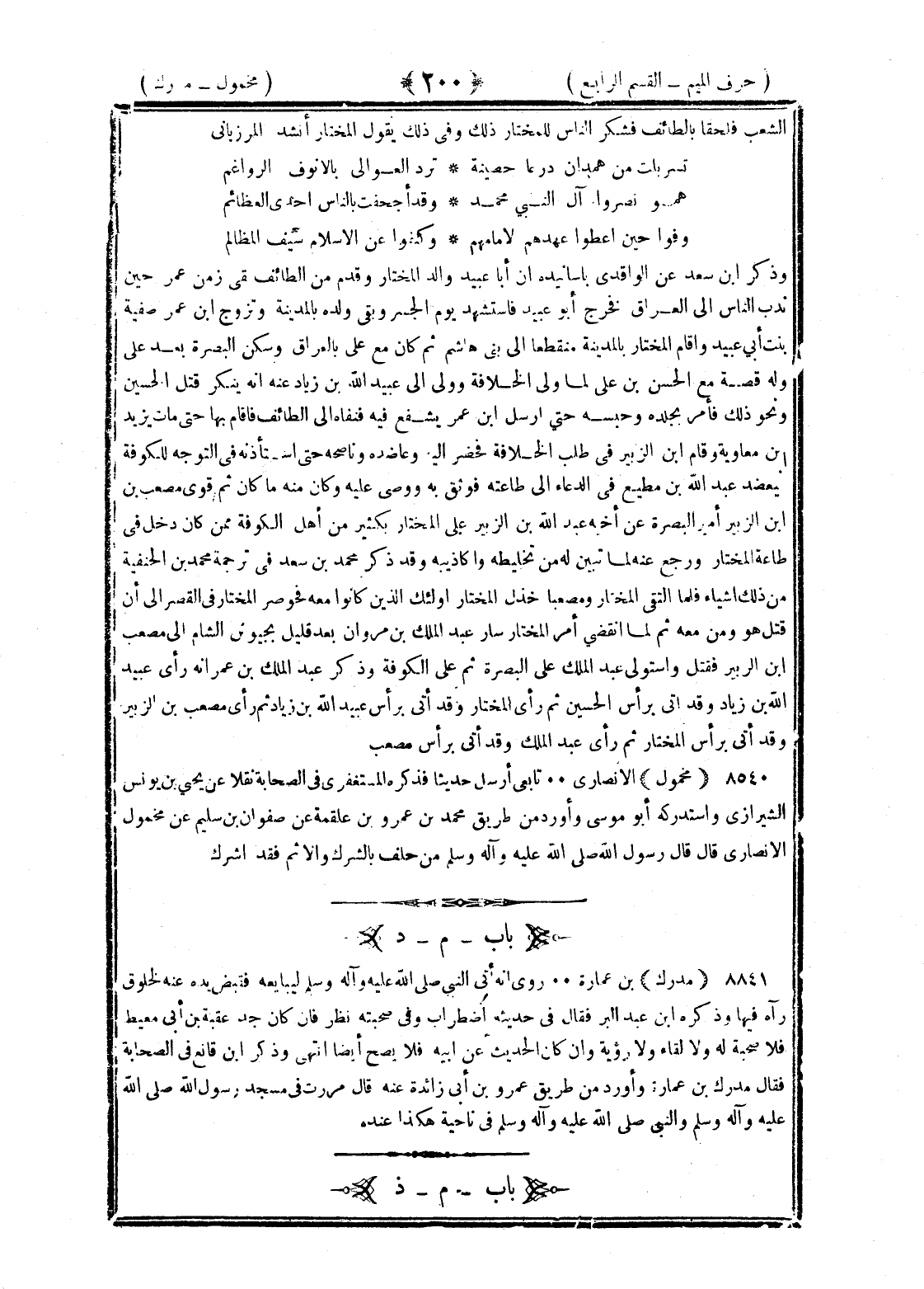 <200> الشعب فلحقا بالطائف فشكر الناس للمختار ذلك وفي ذلك يقول المختار أنشد له المرزباني تسربلت من همدان درعا حصينة ترد العوالي بالأنوف الرواغم همو نصروا آل الرسول محمد وقد أجحفت بالناس إحدى العظائم وفوا حين أعطوا عهدهم لإمامهم وكفوا عن الإسلام سيف المظالم وذكر بن سعد عن الواقدي بأسانيده أن أبا عبيد والد المختار قدم من الطائف في زمن عمر حين ندب الناس إلى العرق فخرج أبو عبيدة فاستشهد يوم الجسر وبقي ولده بالمدينة وتزوج بن عمر صفية بنت أبي عبيد واقام المختار بالمدينة منقطعا إلى بني هاشم ثم كان مع علي بالعراق وسكن البصرة بعد علي وله قصة مع الحسن بن علي لما ولي الخلافة ووشى إلى عبيد الله بن زياد عنه أنه ينكر قتل الحسين ونحو ذلك فأمر بجلده وحبسه حتى أرسل بن عمر يشفع فيه فنفاه إلى الطائف فأقام بها حتى مات يزيد بن معاوية وقام بن الزبير في طلب الخلافة فحضر إليه وعاضده وناصحه حتى استأذنه في التوجه للكوفة ليصعد عبد الله بن مطيع في الدعاء إلى طاعته فوثق به ووصى عليه وكان منه ما كان ثم قوى مصعب بن الزبير أمير البصرة عن أخيه عبد الله بن الزبير على المختار بكثير من أهل الكوفة ممن كان دخل في طاعة المختار ورجع عنه لما تبين له من تخليطه وأكاذيبه وقد ذكر محمد بن سعد في ترجمة محمد بن الحنفية من ذلك أشياء فلما التقى المختار ومصعب خذل المختار أولئك الذين كانوا معه فحوصر المختار في القصر إلى أن قتل هو ومن معه ثم لما انقضى أمر المختار سار عبد الملك بن مروان بعد قليل بجيوش الشام إلى مصعب بن الزبير فقتل واستولى عبد الملك على البصرة ثم على الكوفة وذكر عبد الملك بن عمر أنه رأى عبيد الله بن زياد وقد أتى برأس الحسين ثم رأى المختار وقد أتى برأس عبيد الله بن زياد ثم رأى مصعب بن الزبير وقد أتى برأس المختار ثم رأى عبد الملك وقد أتى برأس مصعب الميم بعدها الدال مدرك بن عمارة روى أنه أتى النبي صلى الله عليه وسلم ليبايعه فقبض يده عنه لخلوق رآه فيها وذكره بن عبد البر فقال في حديثه اضطراب وفي صحبته نظر فإن كان جد عقبة بن أبي معيط فلا صحبة له ولا لقاء ولا رؤية وإن كان الحديث عن أبيه فلا يصح أيضا انتهى وذكر بن قانع في الصحابة فقال مدرك بن عمارة وأورده من طريق بن أبي زائدة عنه قال مررت في مسجد رسول الله صلى الله عليه وسلم والنبي صلى الله عليه وسلم في ناحية هكذا عنده الميم بعدها الذال والراء §